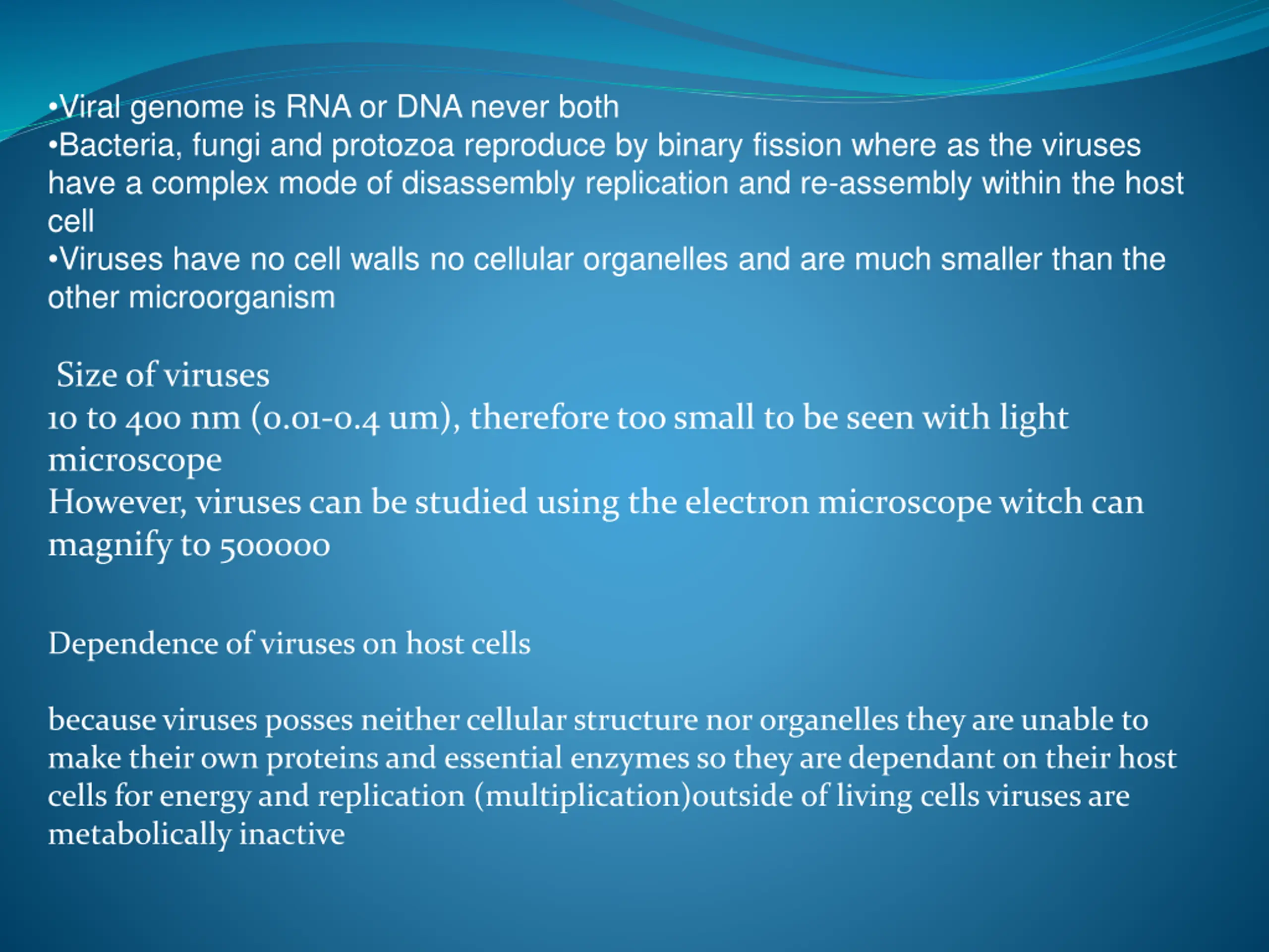 Viral genome is RNA or DNA never both Bacteria, fungi and protozoa reproduce by binary fission where as the viruses have a complex mode of disassembly replication and re-assembly within the host cell Viruses have no cell walls no cellular organelles and are much smaller than the other microorganism Size of viruses 10 to 400 nm (0.01-0.4 um), therefore too small to be seen with light microscope However, viruses can be studied using the electron microscope witch can magnify to 500000 Dependence of viruses on host cells because viruses posses neither cellular structure nor organelles they are unable to make their own proteins and essential enzymes so they are dependant on their host cells for energy and replication (multiplication)outside of living cells viruses are metabolically inactive