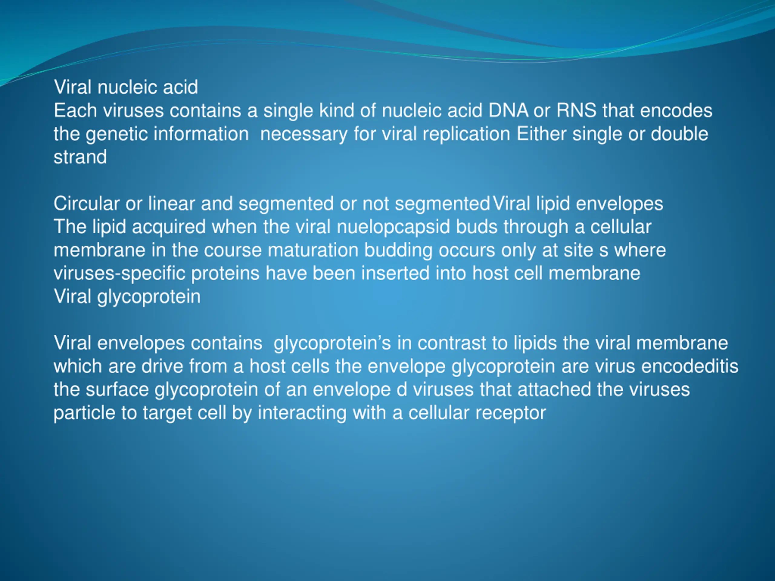 Viral nucleic acid Each viruses contains a single kind of nucleic acid DNA or RNS that encodes the genetic information necessary for viral replication Either single or double strand Circular or linear and segmented or not segmentedViral lipid envelopes The lipid acquired when the viral nuelopcapsid buds through a cellular membrane in the course maturation budding occurs only at site s where viruses-specific proteins have been inserted into host cell membrane Viral glycoprotein Viral envelopes contains glycoprotein s in contrast to lipids the viral membrane which are drive from a host cells the envelope glycoprotein are virus encodeditis the surface glycoprotein of an envelope d viruses that attached the viruses particle to target cell by interacting with a cellular receptor