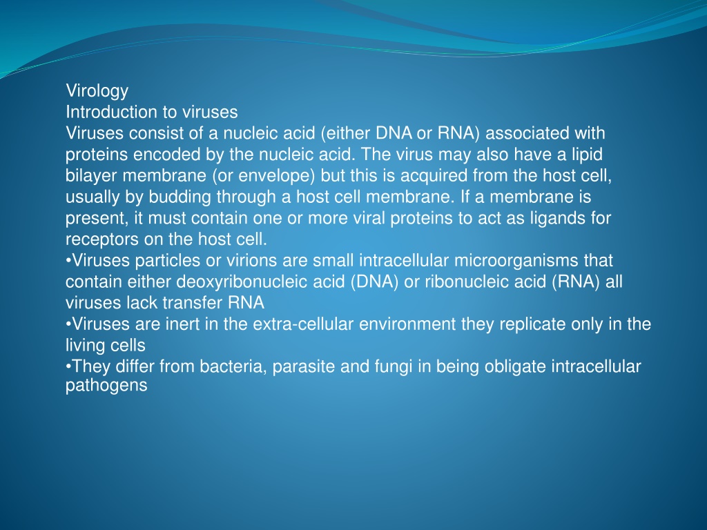 Virology Introduction to viruses Viruses consist of a nucleic acid (either DNA or RNA) associated with proteins encoded by the nucleic acid. The virus may also have a lipid bilayer membrane (or envelope) but this is acquired from the host cell, usually by budding through a host cell membrane. If a membrane is present, it must contain one or more viral proteins to act as ligands for receptors on the host cell. Viruses particles or virions are small intracellular microorganisms that contain either deoxyribonucleic acid (DNA) or ribonucleic acid (RNA) all viruses lack transfer RNA Viruses are inert in the extra-cellular environment they replicate only in the living cells They differ from bacteria, parasite and fungi in being obligate intracellular pathogens