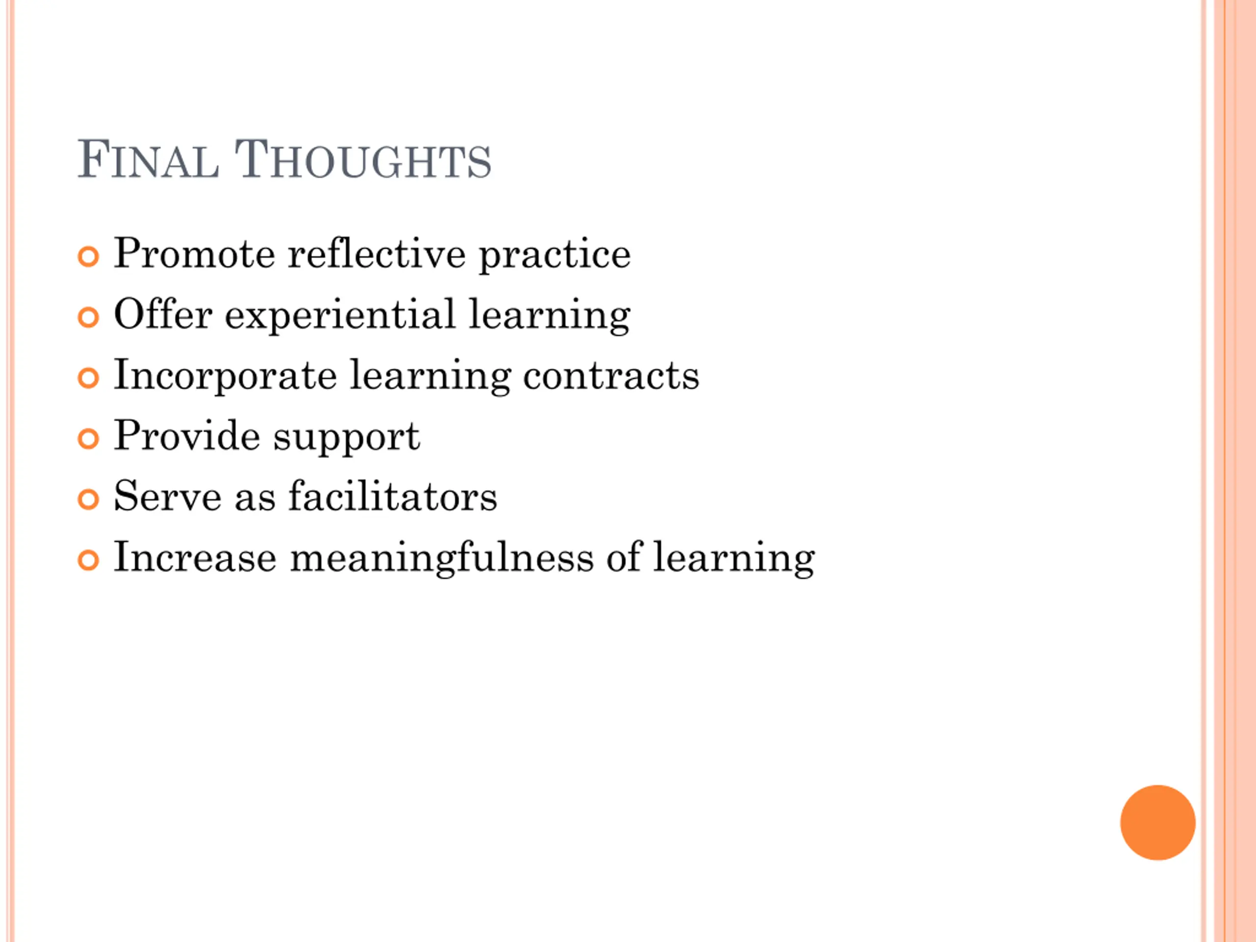 FINAL THOUGHTS Promote reflective practice Offer experiential learning Incorporate learning contracts Provide support Serve as facilitators Increase meaningfulness of learning