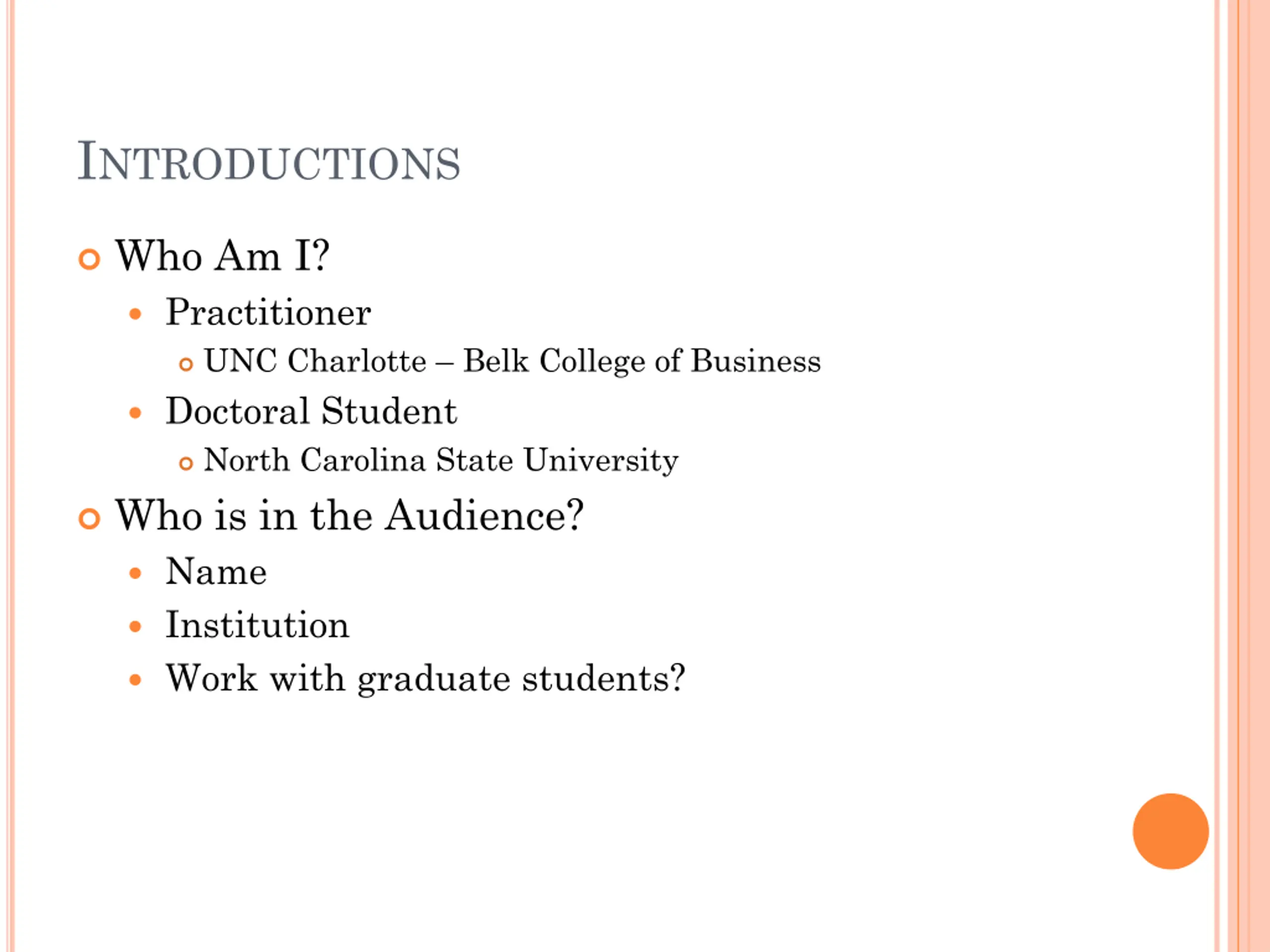 INTRODUCTIONS Who Am I? Practitioner UNC Charlotte Belk College of Business Doctoral Student North Carolina State University Who is in the Audience? Name Institution Work with graduate students?