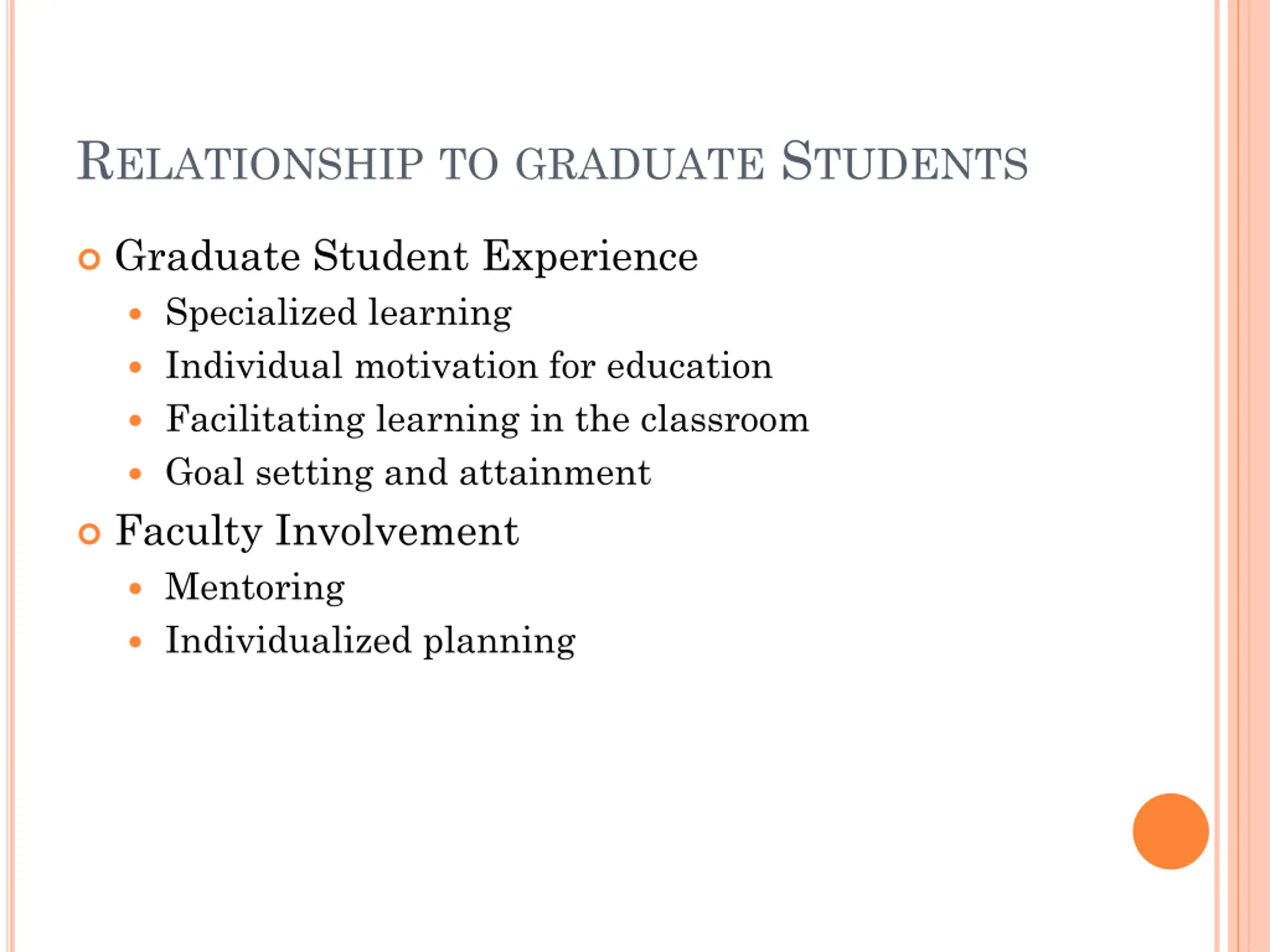 RELATIONSHIP TO GRADUATE STUDENTS Graduate Student Experience Specialized learning Individual motivation for education Facilitating learning in the classroom Goal setting and attainment Faculty Involvement Mentoring Individualized planning