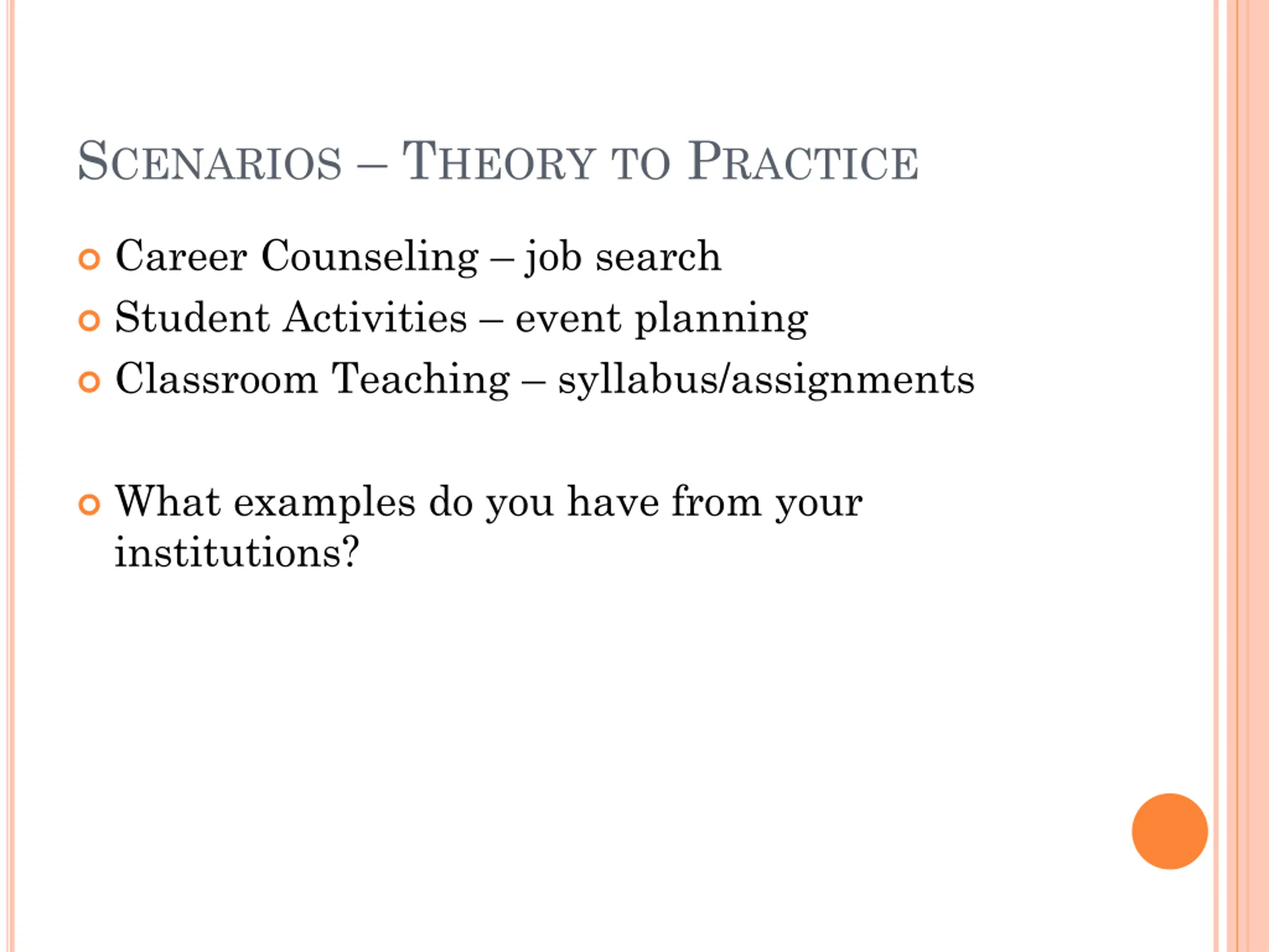 SCENARIOS THEORY TO PRACTICE Career Counseling job search Student Activities event planning Classroom Teaching syllabus/assignments What examples do you have from your institutions?