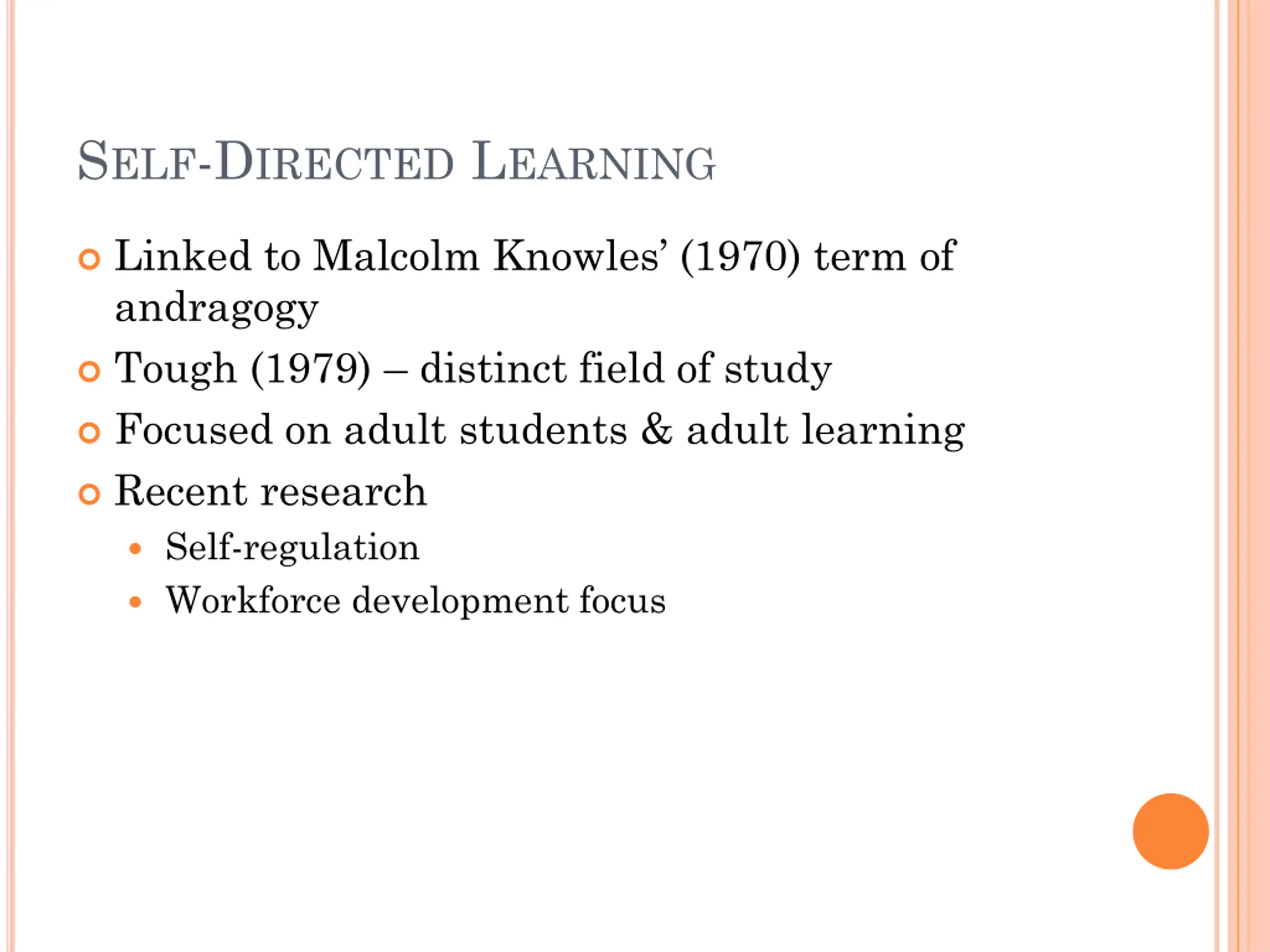 SELF-DIRECTED LEARNING Linked to Malcolm Knowles (1970) term of andragogy Tough (1979) distinct field of study Focused on adult students & adult learning Recent research Self-regulation Workforce development focus