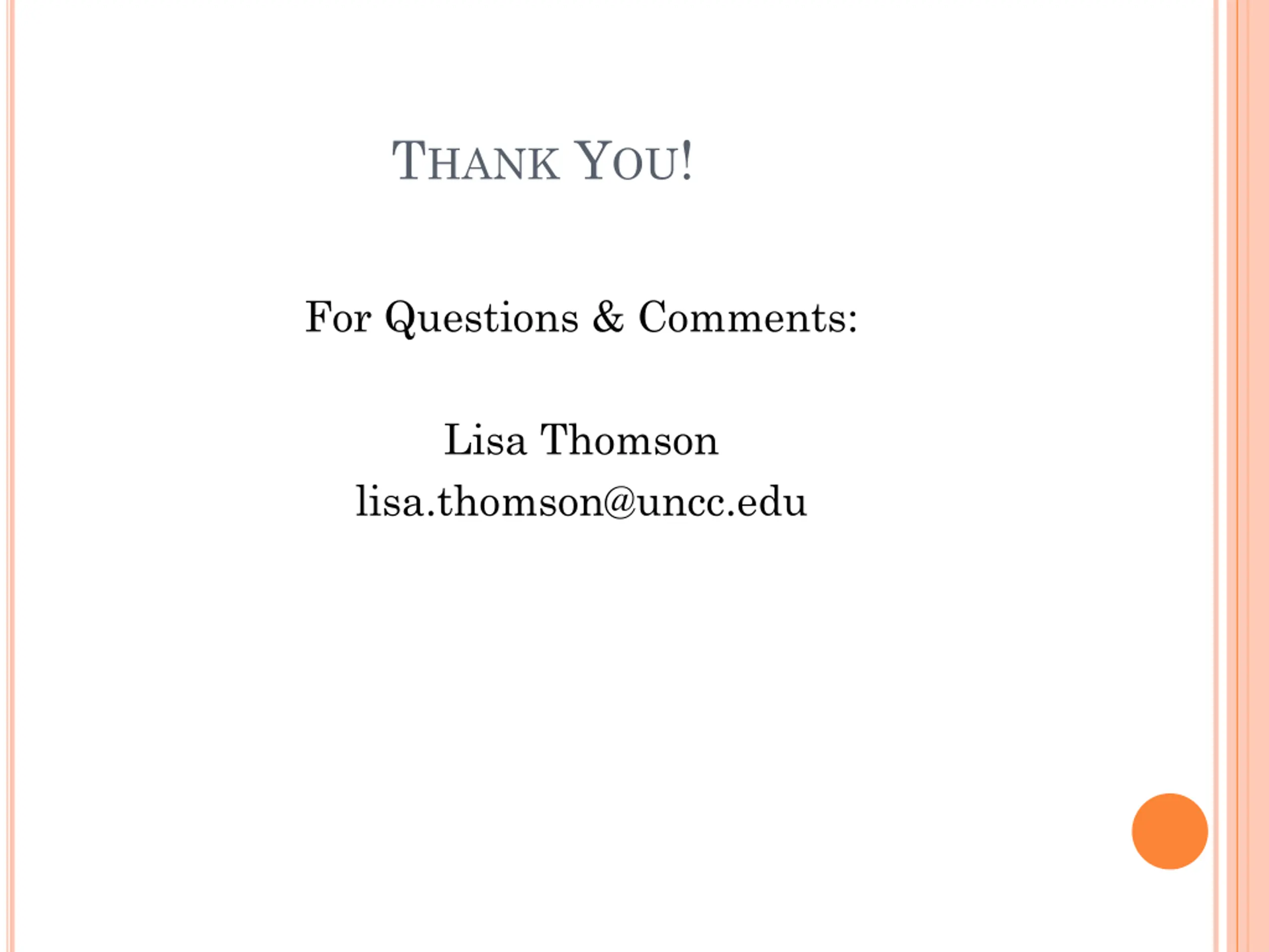 THANK YOU! For Questions & Comments: Lisa Thomson lisa.thomson@uncc.edu