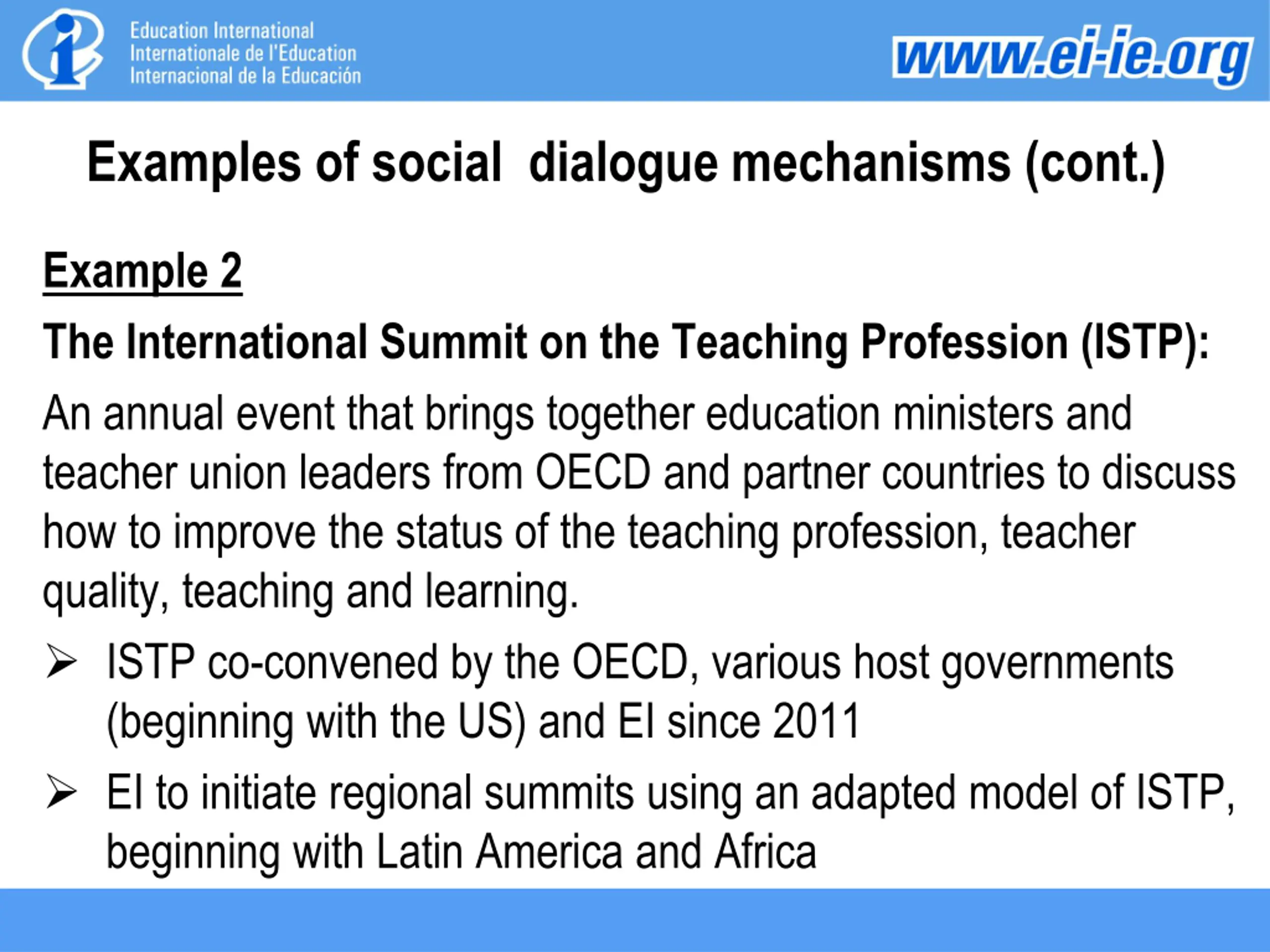 Examples of social dialogue mechanisms (cont.) Example 2 The International Summit on the Teaching Profession (ISTP): An annual event that brings together education ministers and teacher union leaders from OECD and partner countries to discuss how to improve the status of the teaching profession, teacher quality, teaching and learning. ISTP co-convened by the OECD, various host governments (beginning with the US) and EI since 2011 EI to initiate regional summits using an adapted model of ISTP, beginning with Latin America and Africa
