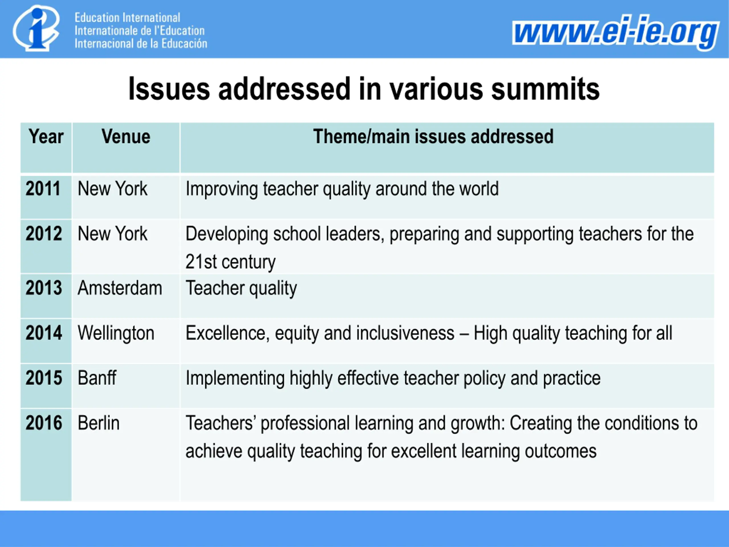 Issues addressed in various summits Year Venue Theme/main issues addressed 2011 New York Improving teacher quality around the world 2012 New York Developing school leaders, preparing and supporting teachers for the 21st century Teacher quality 2013 Amsterdam 2014 Wellington Excellence, equity and inclusiveness High quality teaching for all 2015 Banff Implementing highly effective teacher policy and practice 2016 Berlin Teachers professional learning and growth: Creating the conditions to achieve quality teaching for excellent learning outcomes