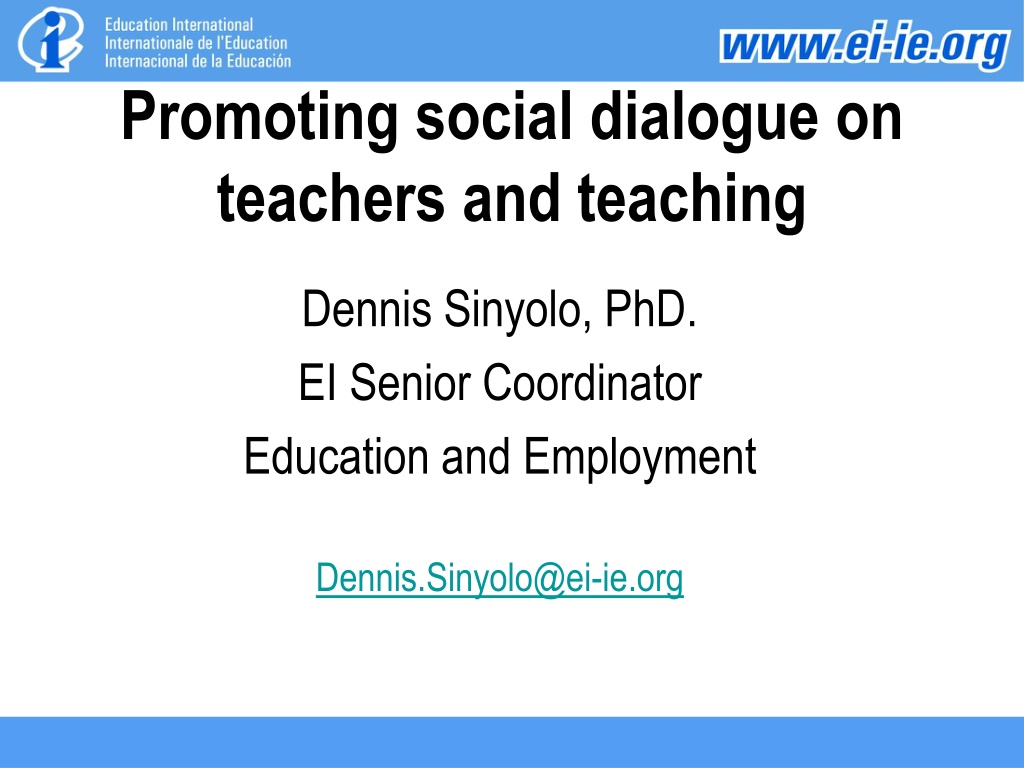 Promoting social dialogue on teachers and teaching Dennis Sinyolo, PhD. EI Senior Coordinator Education and Employment Dennis.Sinyolo@ei-ie.org