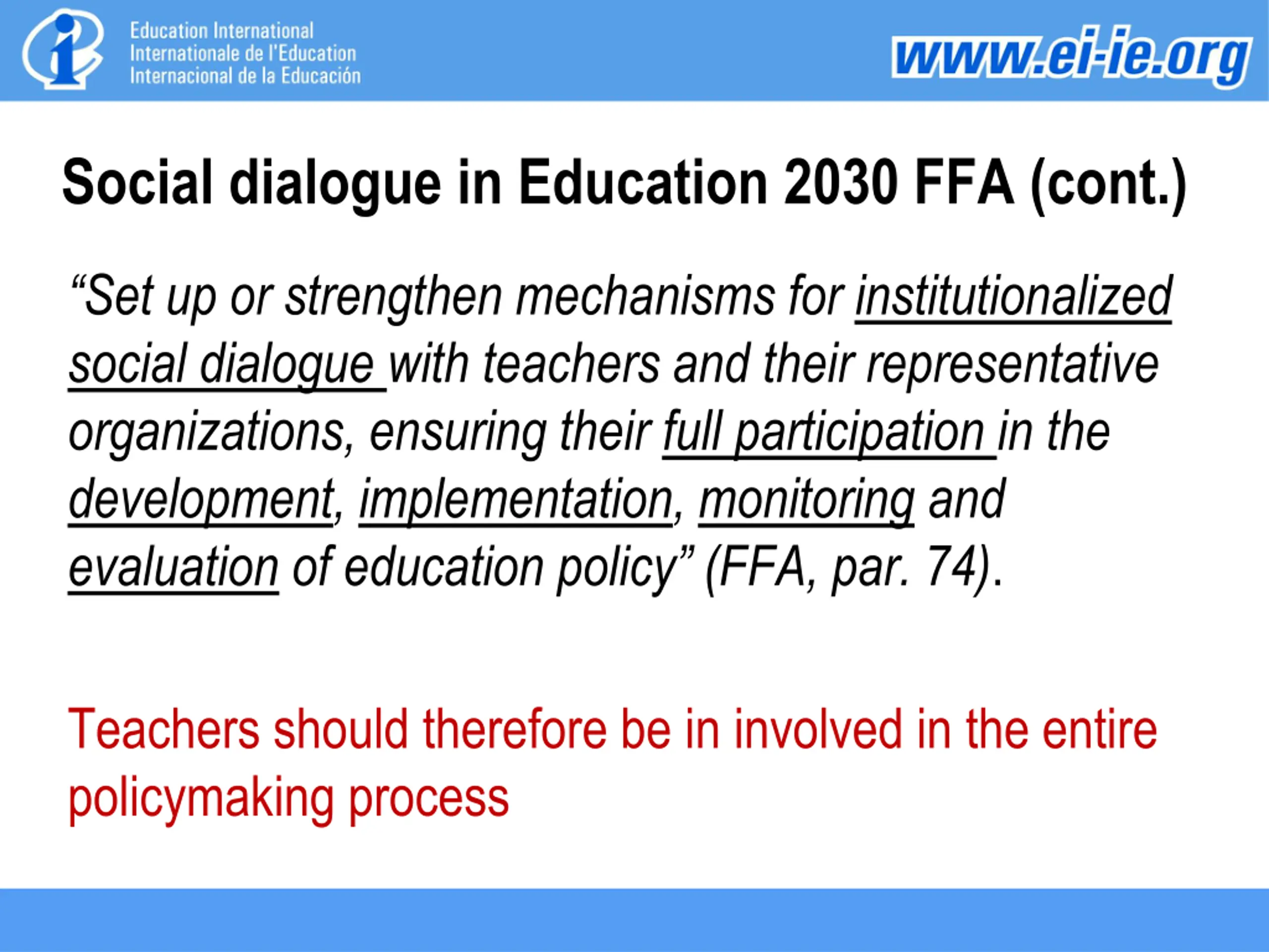 Social dialogue in Education 2030 FFA (cont.) Set up or strengthen mechanisms for institutionalized social dialogue with teachers and their representative organizations, ensuring their full participation in the development, implementation, monitoring and evaluation of education policy (FFA, par. 74). Teachers should therefore be in involved in the entire policymaking process