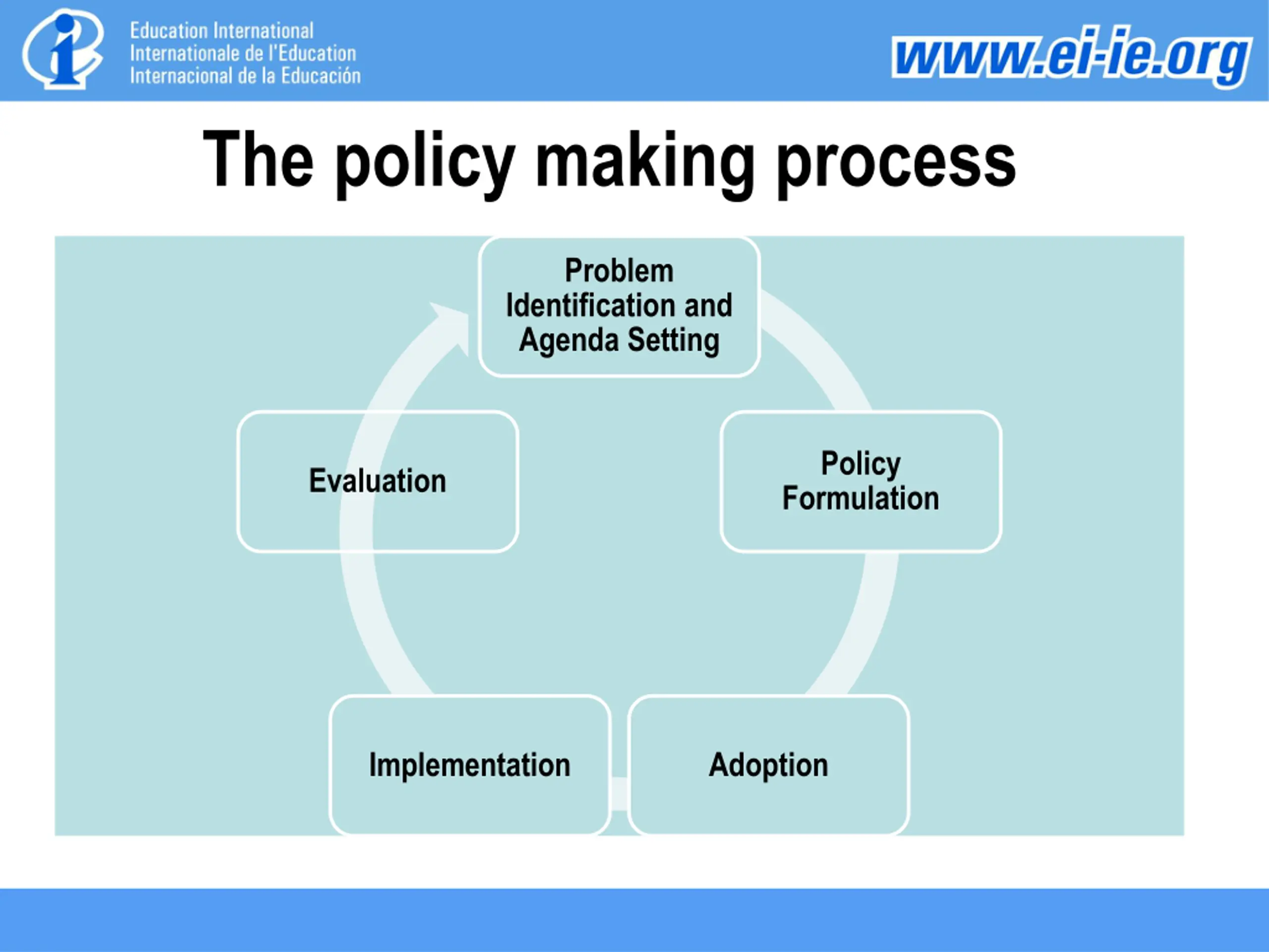 The policy making process Problem Identification and Agenda Setting Policy Formulation Evaluation Implementation Adoption