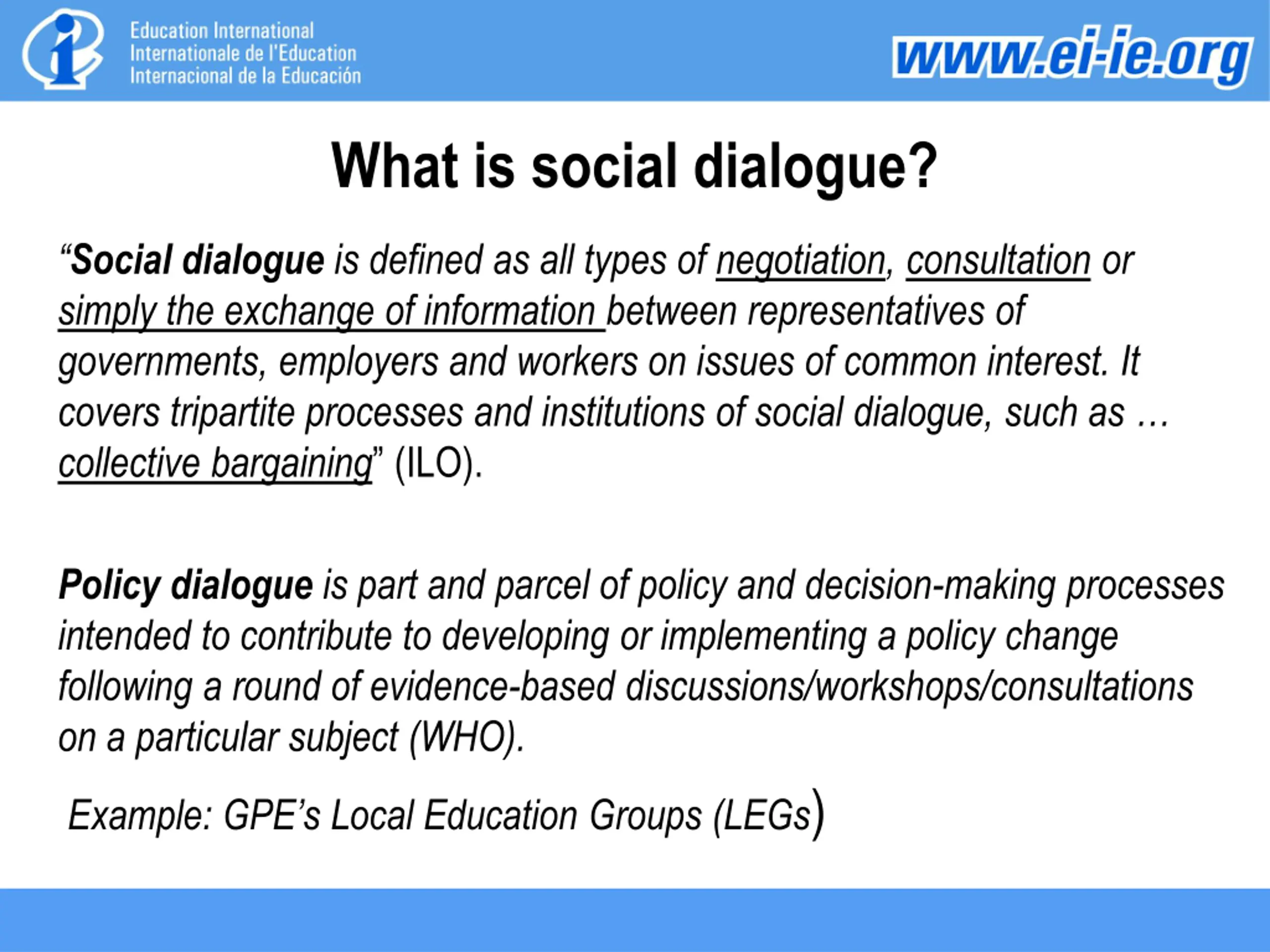 What is social dialogue? Social dialogue is defined as all types of negotiation, consultation or simply the exchange of information between representatives of governments, employers and workers on issues of common interest. It covers tripartite processes and institutions of social dialogue, such as collective bargaining (ILO). Policy dialogue is part and parcel of policy and decision-making processes intended to contribute to developing or implementing a policy change following a round of evidence-based discussions/workshops/consultations on a particular subject (WHO). Example: GPE s Local Education Groups (LEGs)