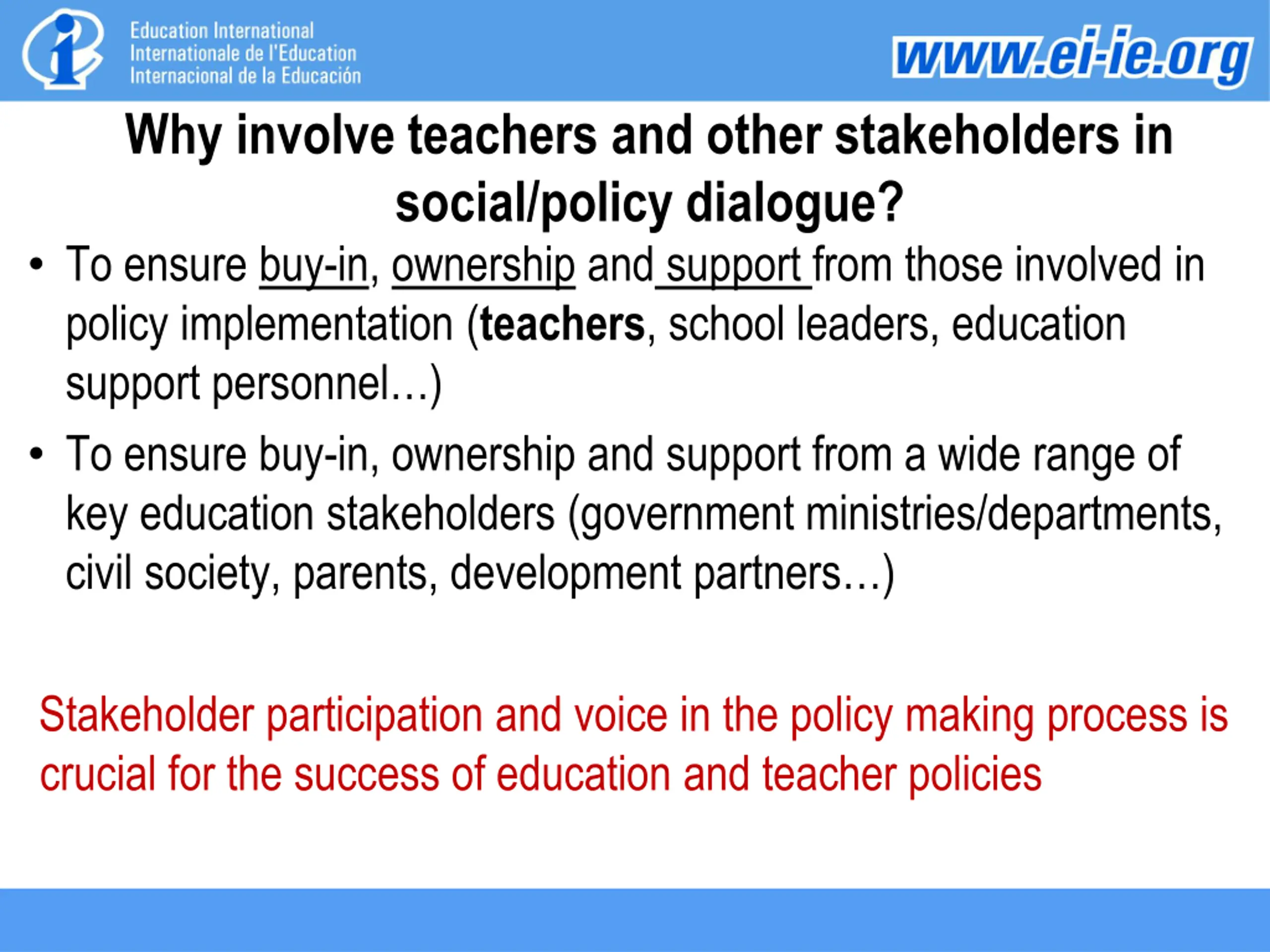 Why involve teachers and other stakeholders in social/policy dialogue? To ensure buy-in, ownership and support from those involved in policy implementation (teachers, school leaders, education support personnel ) To ensure buy-in, ownership and support from a wide range of key education stakeholders (government ministries/departments, civil society, parents, development partners ) Stakeholder participation and voice in the policy making process is crucial for the success of education and teacher policies