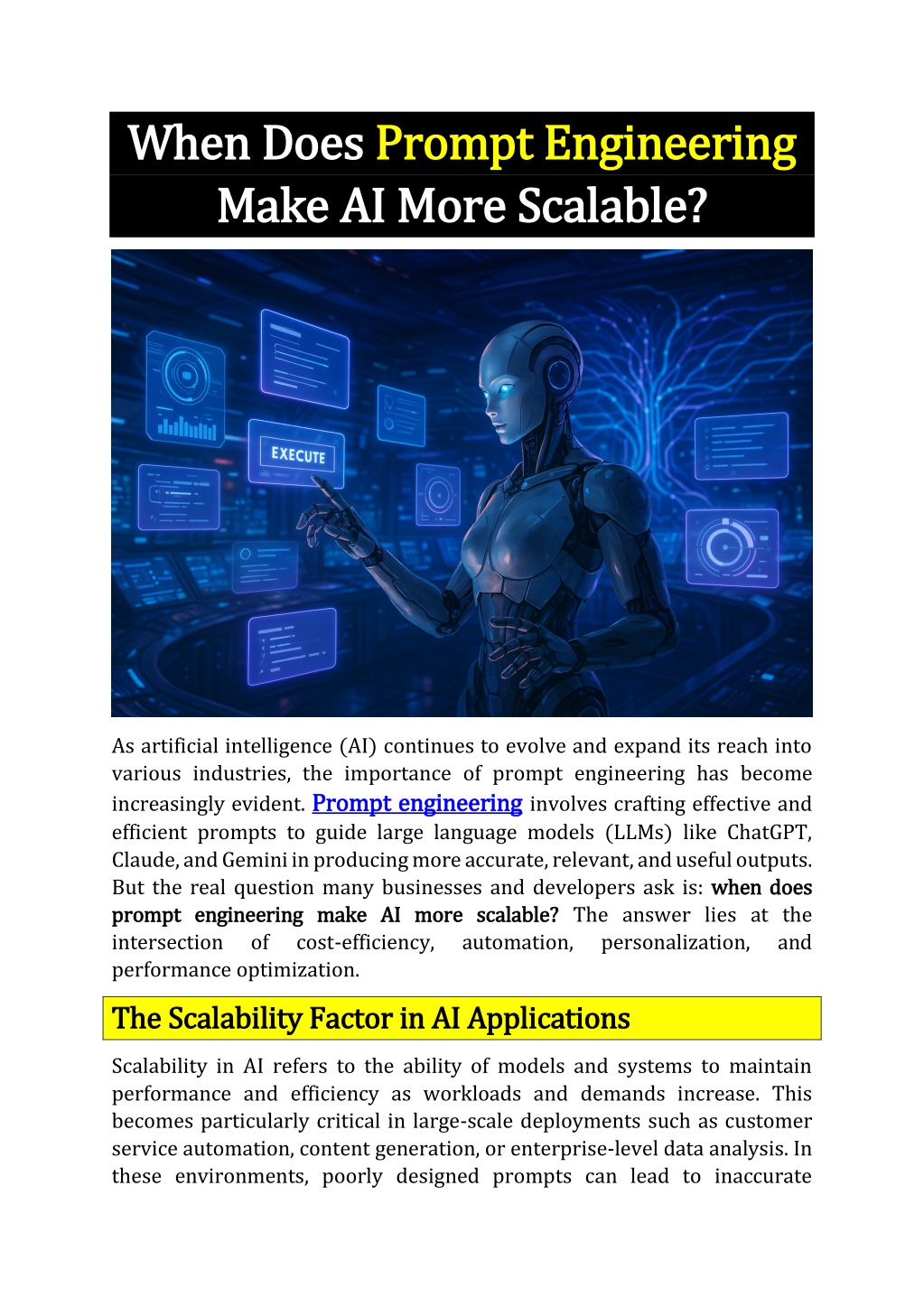 When Does When Does Prompt Engineering Prompt Engineering Make AI More Scalable? Make AI More Scalable? As artificial intelligence (AI) continues to evolve and expand its reach into various industries, the importance of prompt engineering has become increasingly evident. Prompt engineering Prompt engineering involves crafting effective and efficient prompts to guide large language models (LLMs) like ChatGPT, Claude, and Gemini in producing more accurate, relevant, and useful outputs. But the real question many businesses and developers ask is: when does prompt engineering make AI more scalable? prompt engineering make AI more scalable? The answer lies at the intersection of cost-efficiency, automation, performance optimization. when does personalization, and The Scalability Fact The Scalability Factor in AI Applications or in AI Applications Scalability in AI refers to the ability of models and systems to maintain performance and efficiency as workloads and demands increase. This becomes particularly critical in large-scale deployments such as customer service automation, content generation, or enterprise-level data analysis. In these environments, poorly designed prompts can lead to inaccurate