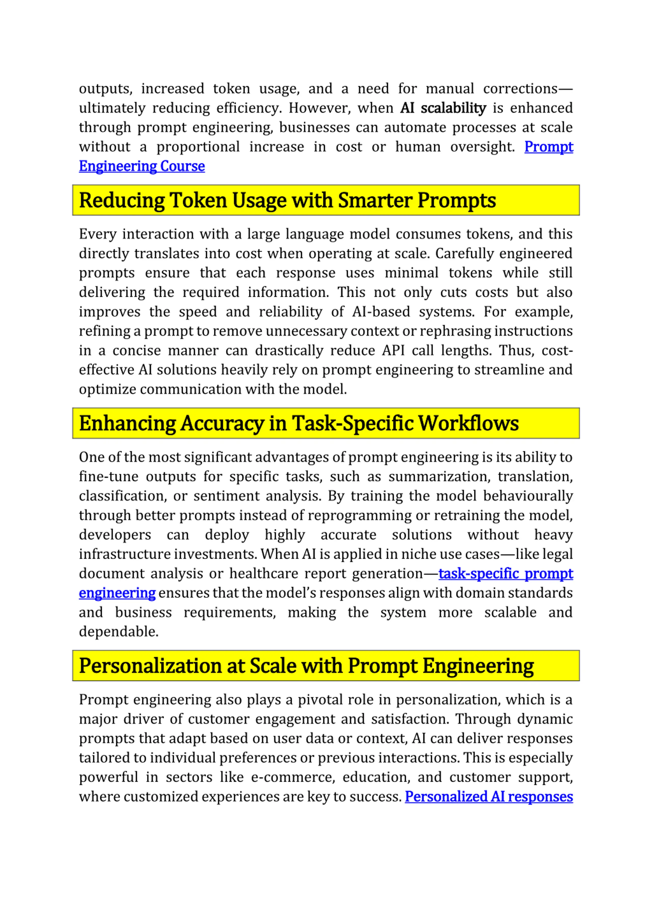 outputs, increased token usage, and a need for manual corrections ultimately reducing efficiency. However, when AI scalability through prompt engineering, businesses can automate processes at scale without a proportional increase in cost or human oversight. Prompt Engineerin Engineering Course g Course AI scalability is enhanced Prompt Reducing Token Usage with Smarter Prompts Reducing Token Usage with Smarter Prompts Every interaction with a large language model consumes tokens, and this directly translates into cost when operating at scale. Carefully engineered prompts ensure that each response uses minimal tokens while still delivering the required information. This not only cuts costs but also improves the speed and reliability of AI-based systems. For example, refining a prompt to remove unnecessary context or rephrasing instructions in a concise manner can drastically reduce API call lengths. Thus, cost- effective AI solutions heavily rely on prompt engineering to streamline and optimize communication with the model. Enhancing Accuracy in Task Enhancing Accuracy in Task- -Specific Workflows Specific Workflows One of the most significant advantages of prompt engineering is its ability to fine-tune outputs for specific tasks, such as summarization, translation, classification, or sentiment analysis. By training the model behaviourally through better prompts instead of reprogramming or retraining the model, developers can deploy highly accurate solutions without heavy infrastructure investments. When AI is applied in niche use cases like legal document analysis or healthcare report generation task engineering engineering ensures that the model s responses align with domain standards and business requirements, making the system more scalable and dependable. task- -specific prompt specific prompt Personalization at Scale with Pr Personalization at Scale with Prompt Engineering ompt Engineering Prompt engineering also plays a pivotal role in personalization, which is a major driver of customer engagement and satisfaction. Through dynamic prompts that adapt based on user data or context, AI can deliver responses tailored to individual preferences or previous interactions. This is especially powerful in sectors like e-commerce, education, and customer support, where customized experiences are key to success. Personalized AI responses Personalized AI responses