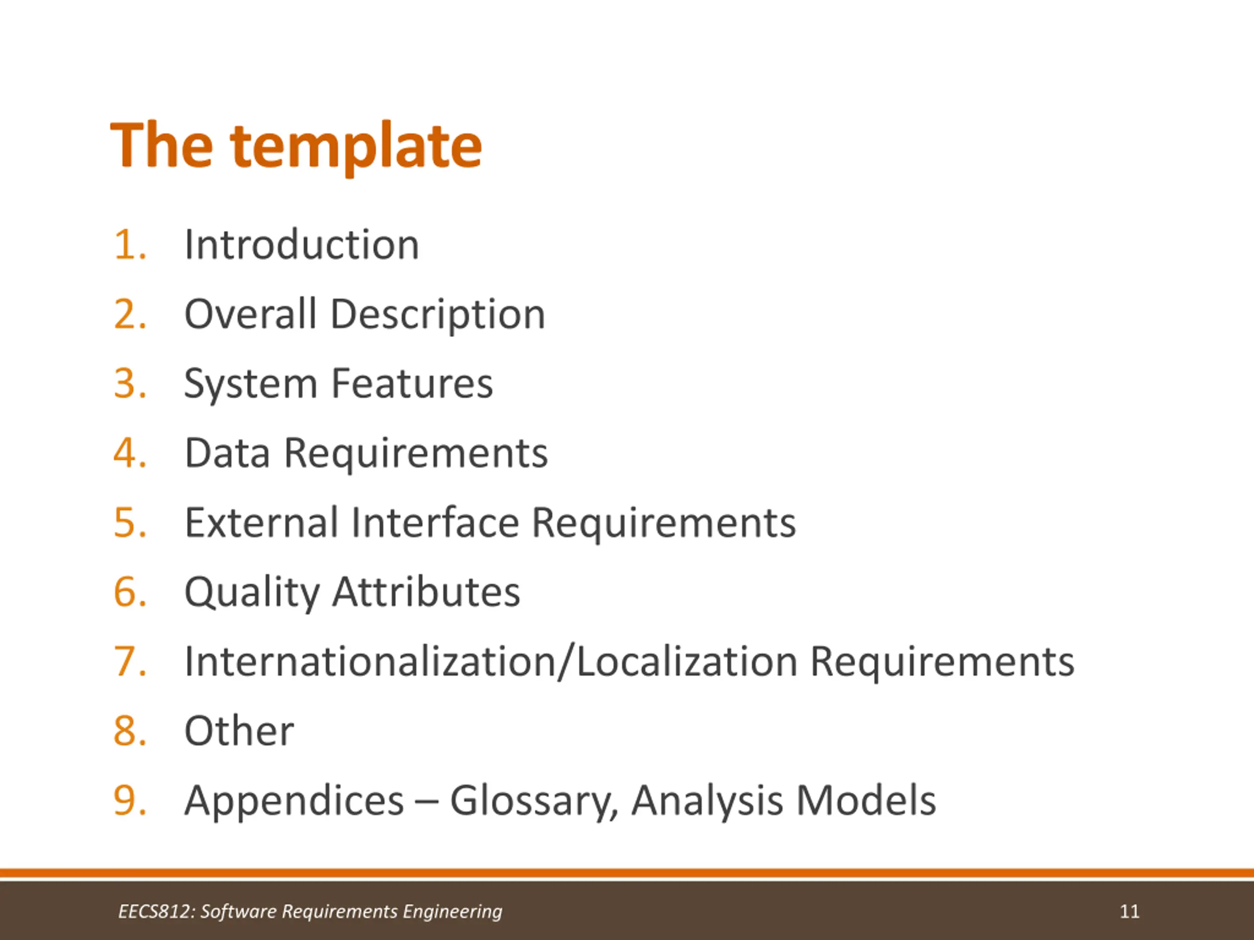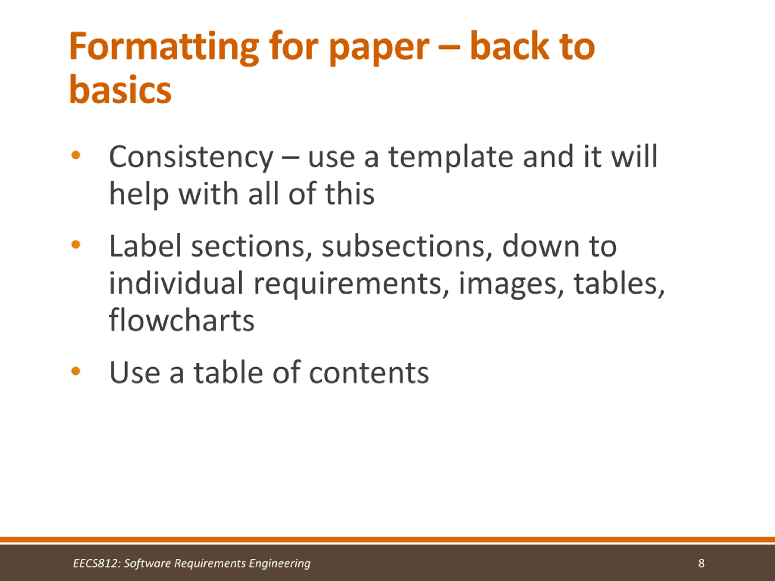 Formatting for paper back to basics Consistency use a template and it will help with all of this Label sections, subsections, down to individual requirements, images, tables, flowcharts Use a table of contents EECS812: Software Requirements Engineering 8
