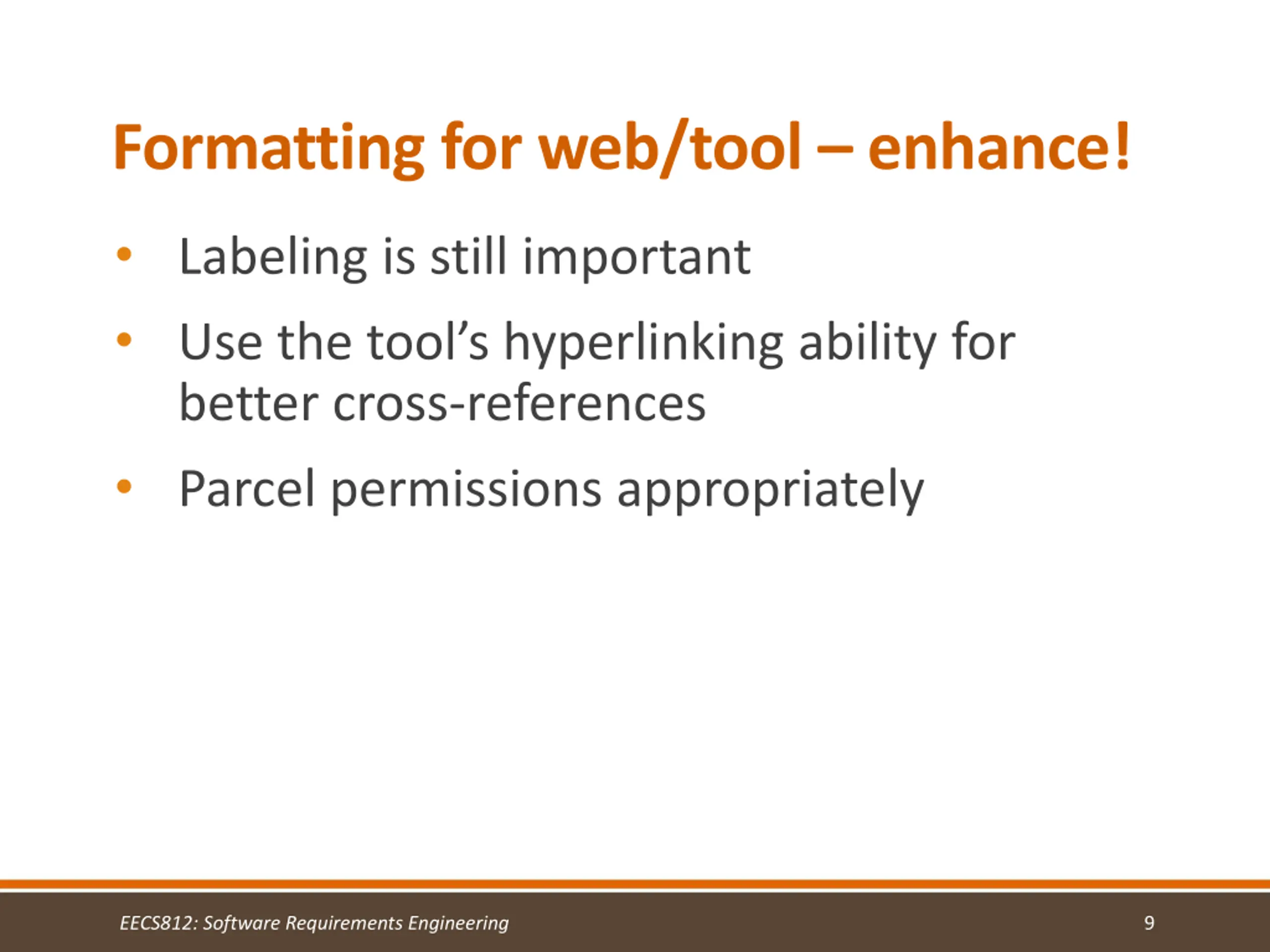 Formatting for web/tool enhance! Labeling is still important Use the tool s hyperlinking ability for better cross-references Parcel permissions appropriately EECS812: Software Requirements Engineering 9