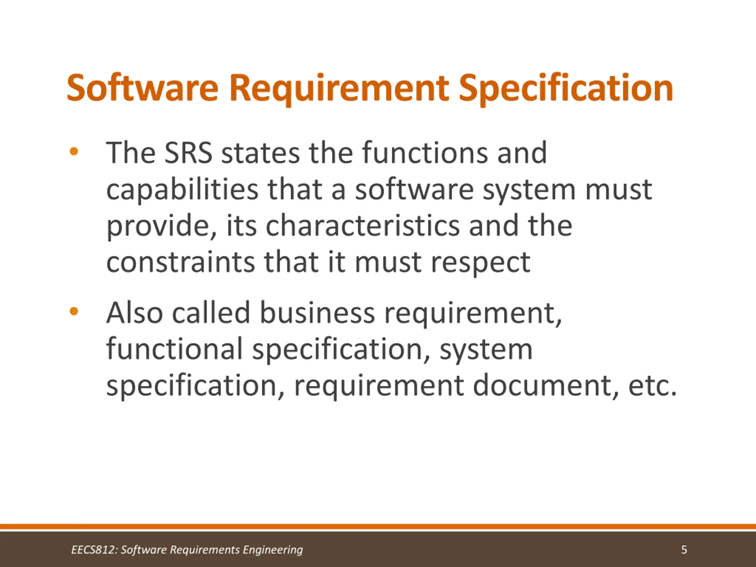 Software Requirement Specification The SRS states the functions and capabilities that a software system must provide, its characteristics and the constraints that it must respect Also called business requirement, functional specification, system specification, requirement document, etc. EECS812: Software Requirements Engineering 5