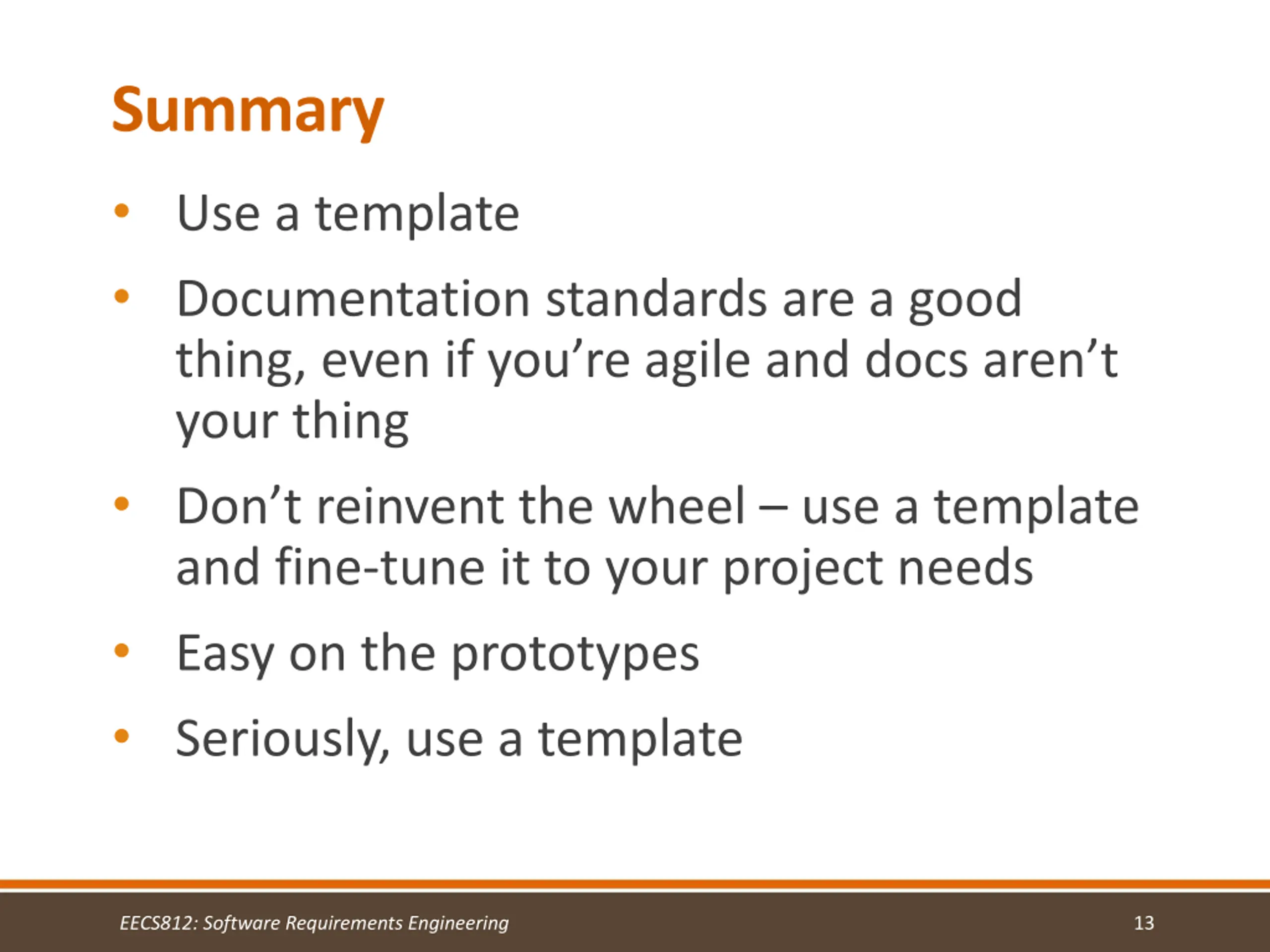 Summary Use a template Documentation standards are a good thing, even if you re agile and docs aren t your thing Don t reinvent the wheel use a template and fine-tune it to your project needs Easy on the prototypes Seriously, use a template EECS812: Software Requirements Engineering 13