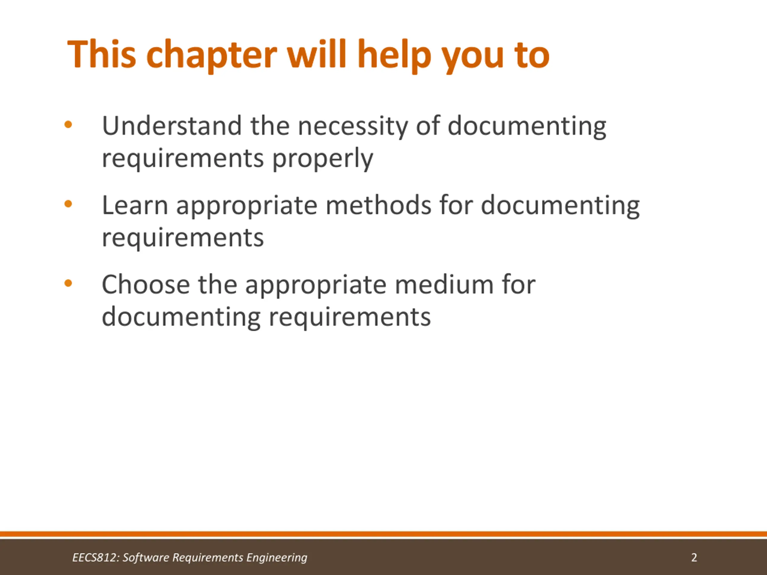 This chapter will help you to Understand the necessity of documenting requirements properly Learn appropriate methods for documenting requirements Choose the appropriate medium for documenting requirements EECS812: Software Requirements Engineering 2