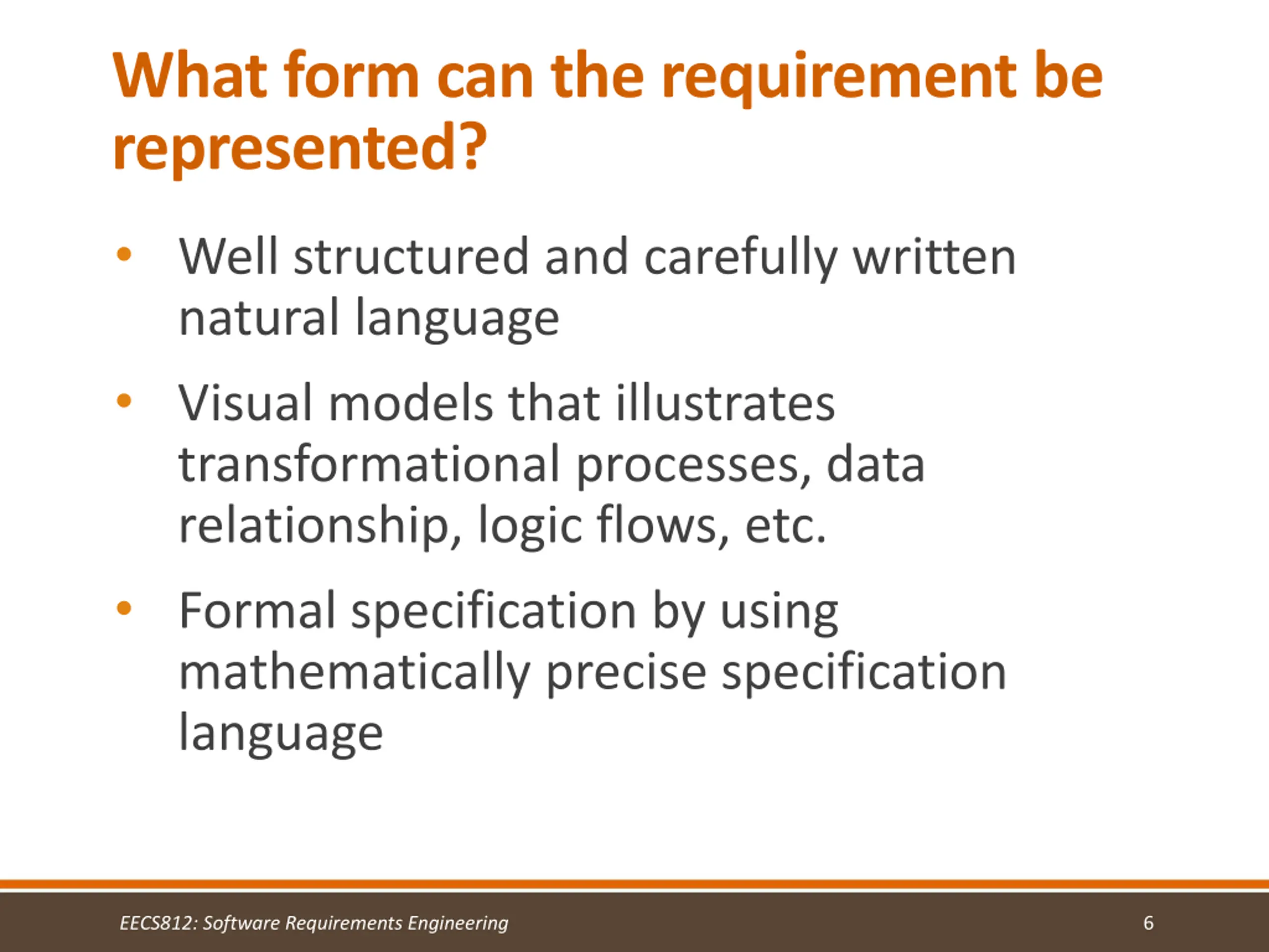 What form can the requirement be represented? Well structured and carefully written natural language Visual models that illustrates transformational processes, data relationship, logic flows, etc. Formal specification by using mathematically precise specification language EECS812: Software Requirements Engineering 6