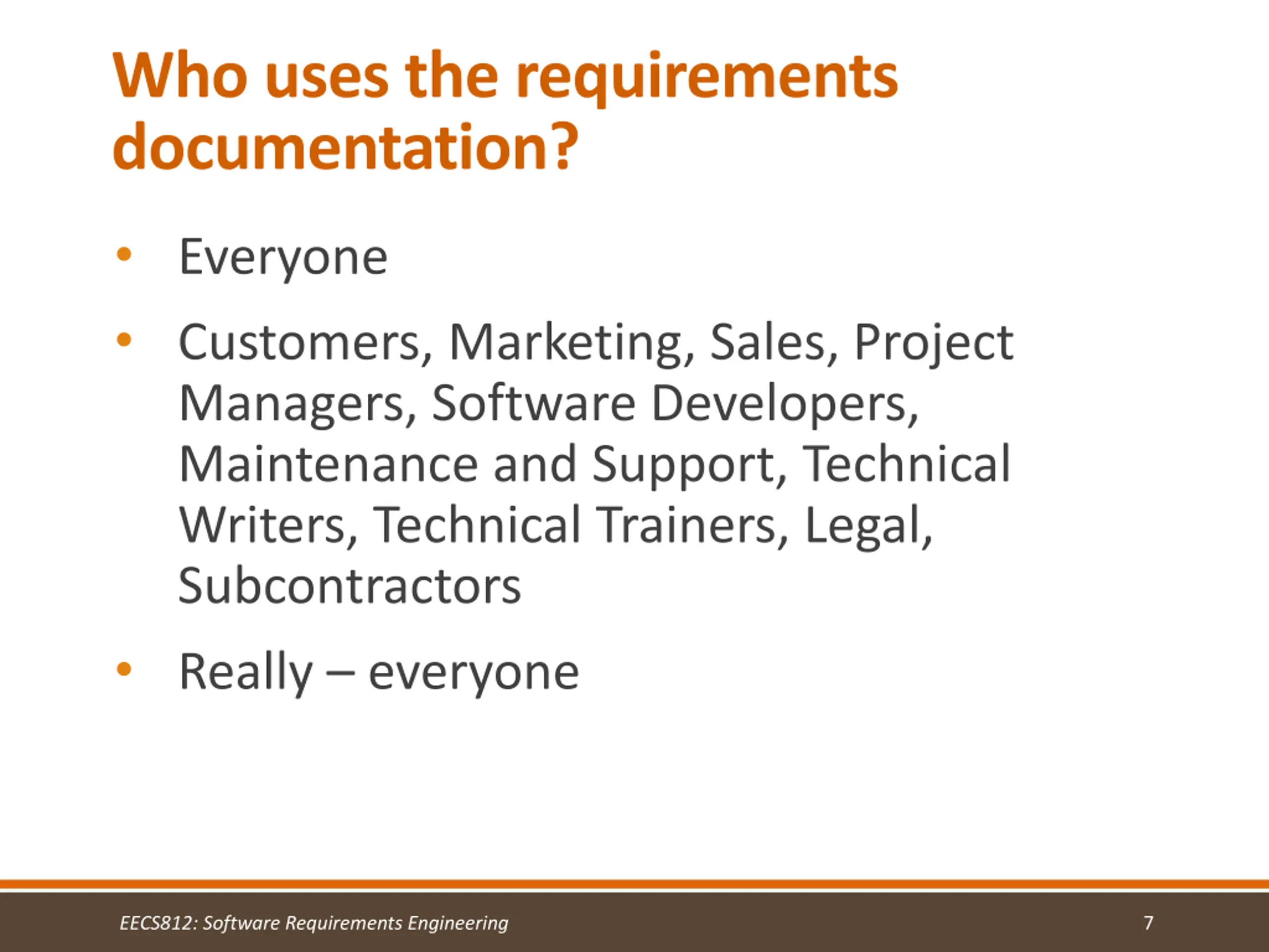 Who uses the requirements documentation? Everyone Customers, Marketing, Sales, Project Managers, Software Developers, Maintenance and Support, Technical Writers, Technical Trainers, Legal, Subcontractors Really everyone EECS812: Software Requirements Engineering 7