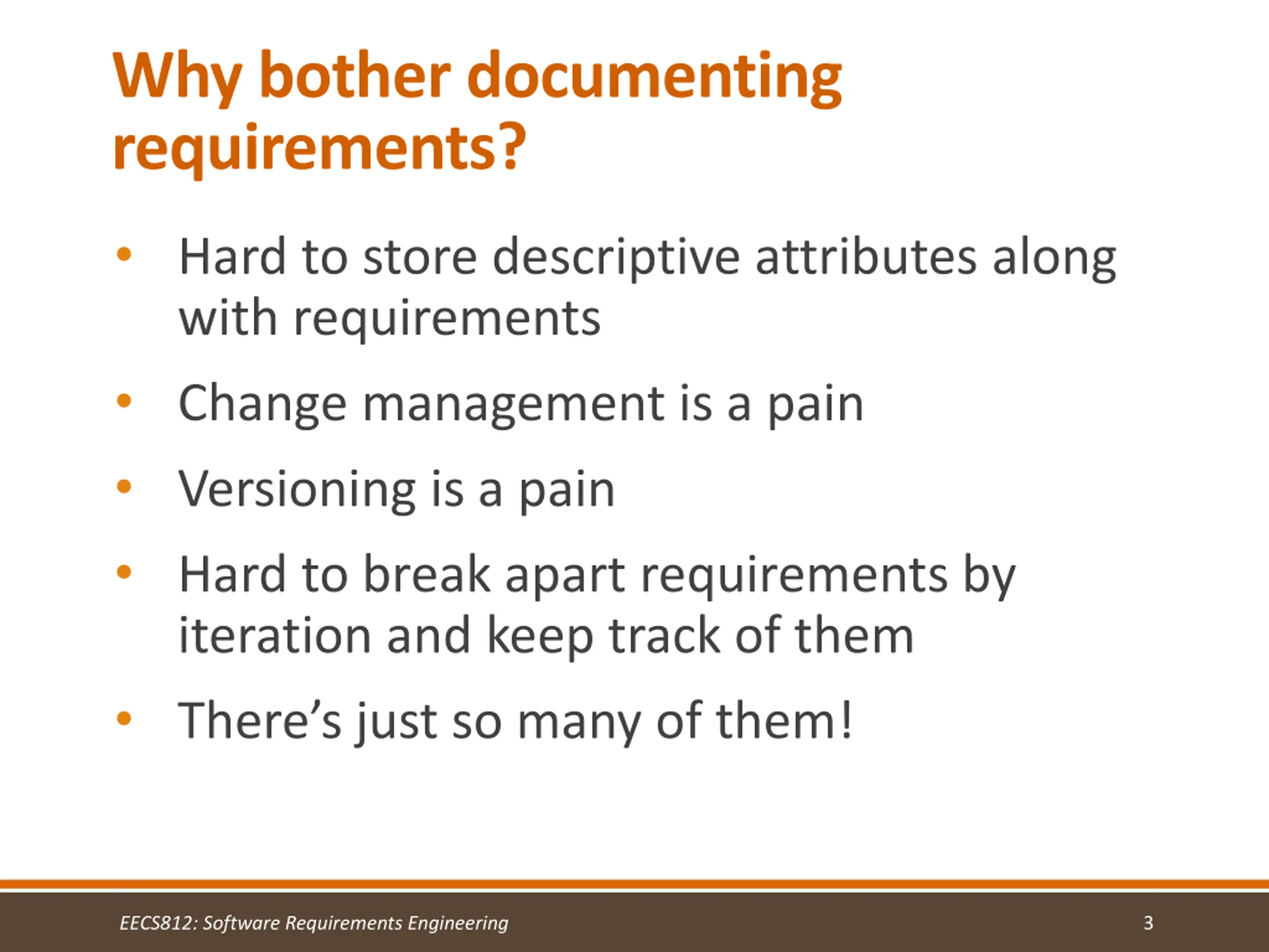 Why bother documenting requirements? Hard to store descriptive attributes along with requirements Change management is a pain Versioning is a pain Hard to break apart requirements by iteration and keep track of them There s just so many of them! EECS812: Software Requirements Engineering 3