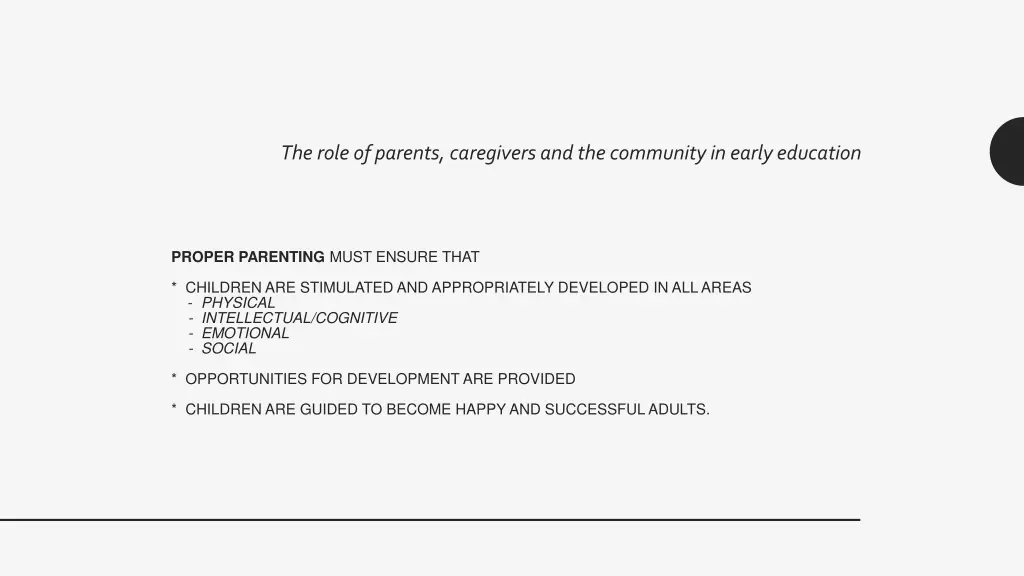 The role of parents, caregivers and the community in early education PROPER PARENTING MUST ENSURE THAT * CHILDREN ARE STIMULATED AND APPROPRIATELY DEVELOPED IN ALL AREAS - PHYSICAL - INTELLECTUAL/COGNITIVE - EMOTIONAL - SOCIAL * OPPORTUNITIES FOR DEVELOPMENT ARE PROVIDED * CHILDREN ARE GUIDED TO BECOME HAPPY AND SUCCESSFUL ADULTS.