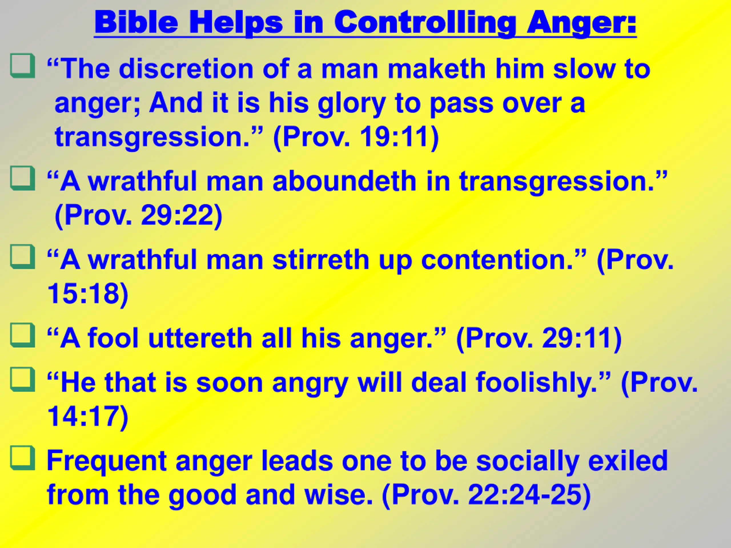 Bible Helps in Controlling Anger: Bible Helps in Controlling Anger: The discretion of a man maketh him slow to anger; And it is his glory to pass over a transgression. (Prov. 19:11) A wrathful man aboundeth in transgression. (Prov. 29:22) A wrathful man stirreth up contention. (Prov. 15:18) A fool uttereth all his anger. (Prov. 29:11) He that is soon angry will deal foolishly. (Prov. 14:17) Frequent anger leads one to be socially exiled from the good and wise. (Prov. 22:24-25)