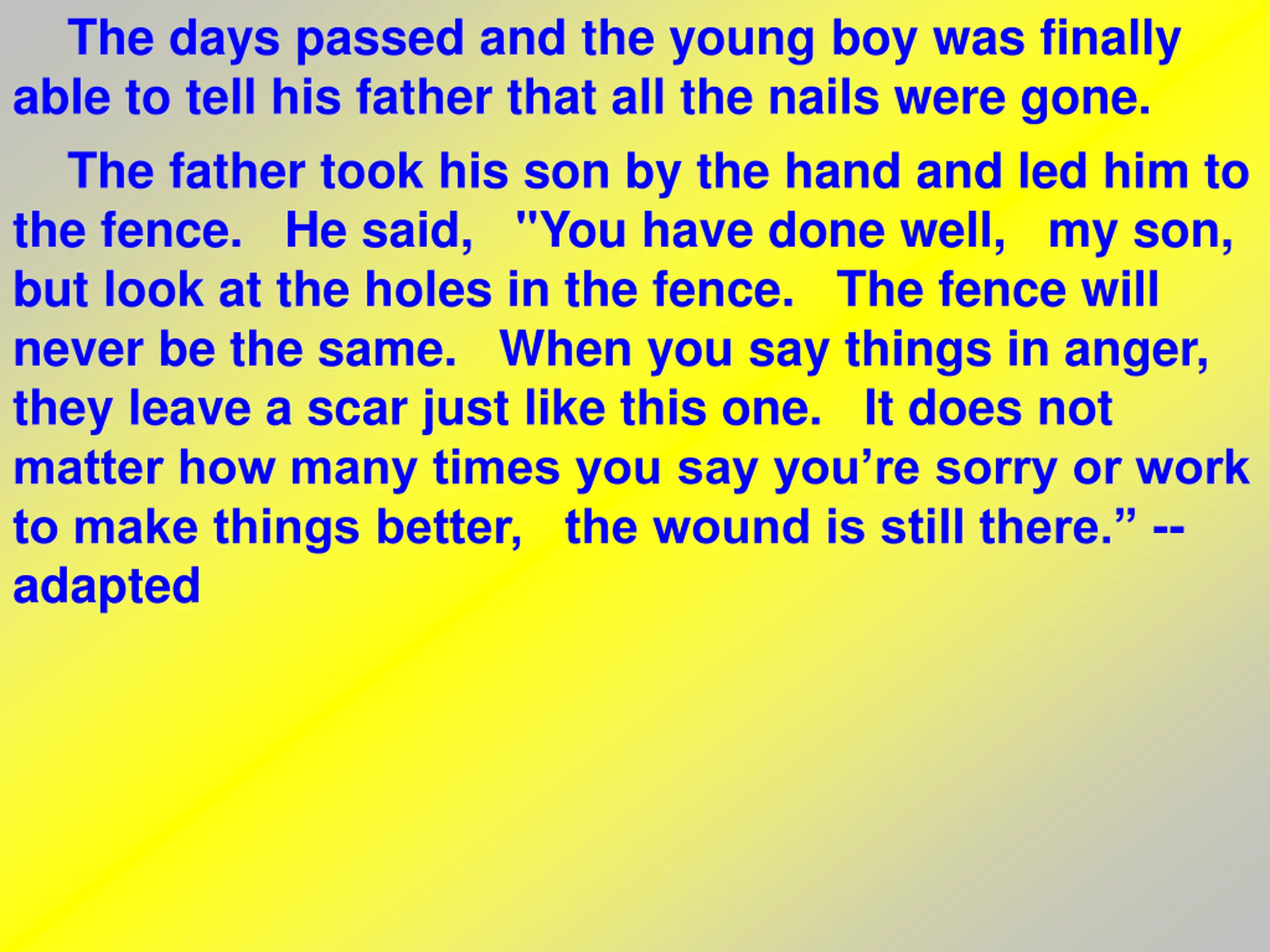 The days passed and the young boy was finally able to tell his father that all the nails were gone. The father took his son by the hand and led him to the fence. He said, "You have done well, my son, but look at the holes in the fence. The fence will never be the same. When you say things in anger, they leave a scar just like this one. It does not matter how many times you say you re sorry or work to make things better, the wound is still there. -- adapted