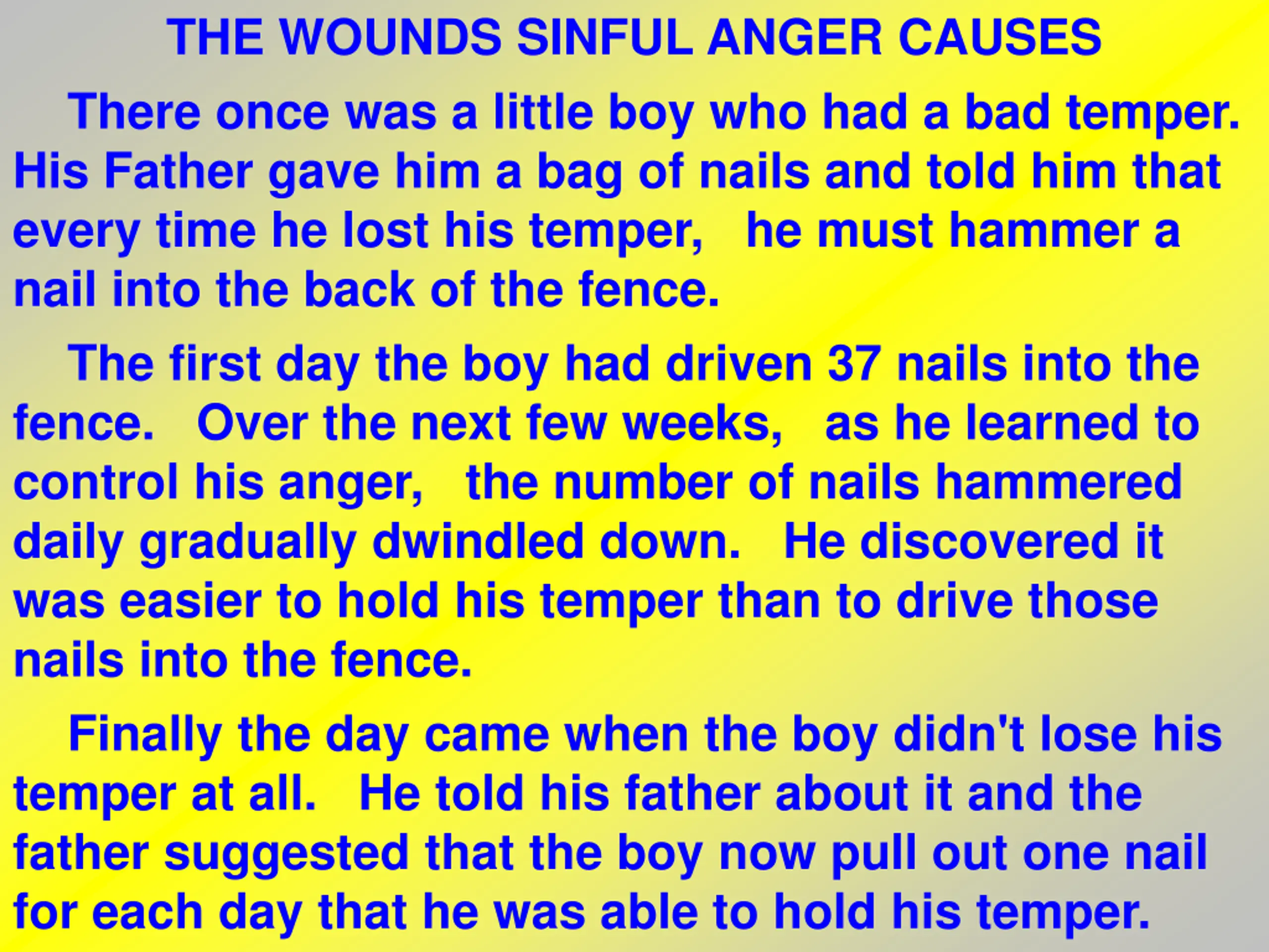 THE WOUNDS SINFUL ANGER CAUSES There once was a little boy who had a bad temper. His Father gave him a bag of nails and told him that every time he lost his temper, he must hammer a nail into the back of the fence. The first day the boy had driven 37 nails into the fence. Over the next few weeks, as he learned to control his anger, the number of nails hammered daily gradually dwindled down. He discovered it was easier to hold his temper than to drive those nails into the fence. Finally the day came when the boy didn't lose his temper at all. He told his father about it and the father suggested that the boy now pull out one nail for each day that he was able to hold his temper.