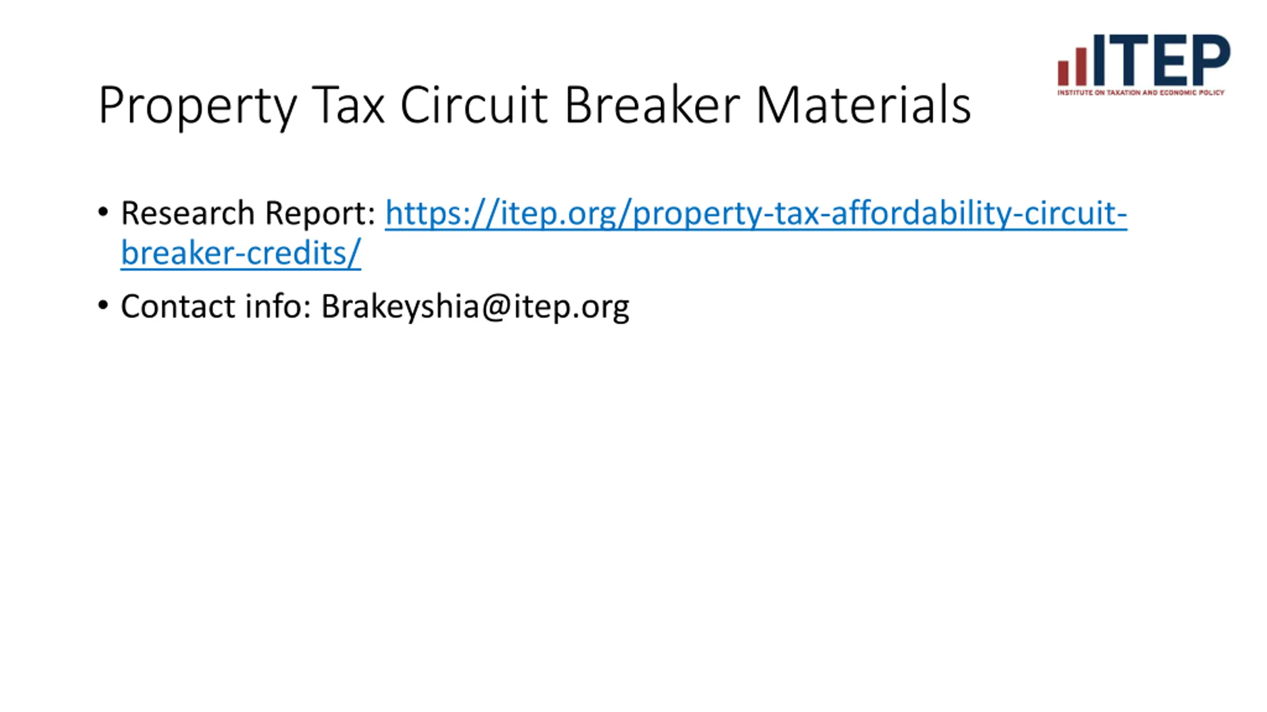 Property Tax Circuit Breaker Materials Research Report: https://itep.org/property-tax-affordability-circuit- breaker-credits/ Contact info: Brakeyshia@itep.org