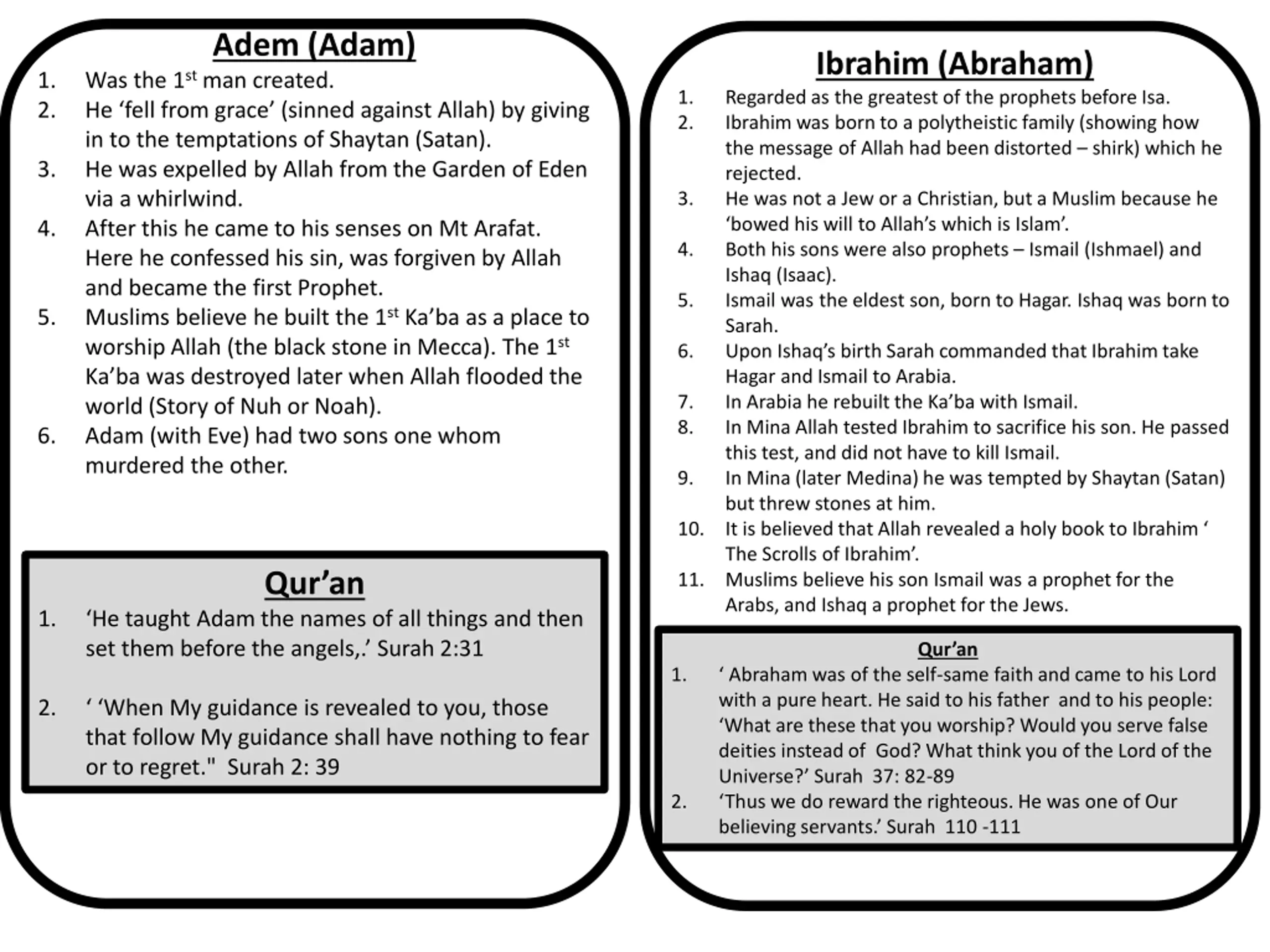 Adem (Adam) Ibrahim (Abraham) Regarded as the greatest of the prophets before Isa. Ibrahim was born to a polytheistic family (showing how the message of Allah had been distorted shirk) which he rejected. He was not a Jew or a Christian, but a Muslim because he bowed his will to Allah s which is Islam . Both his sons were also prophets Ismail (Ishmael) and Ishaq (Isaac). Ismail was the eldest son, born to Hagar. Ishaq was born to Sarah. Upon Ishaq s birth Sarah commanded that Ibrahim take Hagar and Ismail to Arabia. In Arabia he rebuilt the Ka ba with Ismail. In Mina Allah tested Ibrahim to sacrifice his son. He passed this test, and did not have to kill Ismail. In Mina (later Medina) he was tempted by Shaytan (Satan) but threw stones at him. It is believed that Allah revealed a holy book to Ibrahim The Scrolls of Ibrahim . Muslims believe his son Ismail was a prophet for the Arabs, and Ishaq a prophet for the Jews. Was the 1st man created. He fell from grace (sinned against Allah) by giving in to the temptations of Shaytan (Satan). He was expelled by Allah from the Garden of Eden via a whirlwind. After this he came to his senses on Mt Arafat. Here he confessed his sin, was forgiven by Allah and became the first Prophet. Muslims believe he built the 1stKa ba as a place to worship Allah (the black stone in Mecca). The 1st Ka ba was destroyed later when Allah flooded the world (Story of Nuh or Noah). Adam (with Eve) had two sons one whom murdered the other. 1. 2. 1. 2. 3. 3. 4. 4. 5. 5. 6. 7. 8. 6. 9. 10. Qur an 11. 1. He taught Adam the names of all things and then set them before the angels,. Surah 2:31 Qur an 1. Abraham was of the self-same faith and came to his Lord with a pure heart. He said to his father and to his people: What are these that you worship? Would you serve false deities instead of God? What think you of the Lord of the Universe? Surah 37: 82-89 Thus we do reward the righteous. He was one of Our believing servants. Surah 110 -111 2. When My guidance is revealed to you, those that follow My guidance shall have nothing to fear or to regret." Surah 2: 39 2.