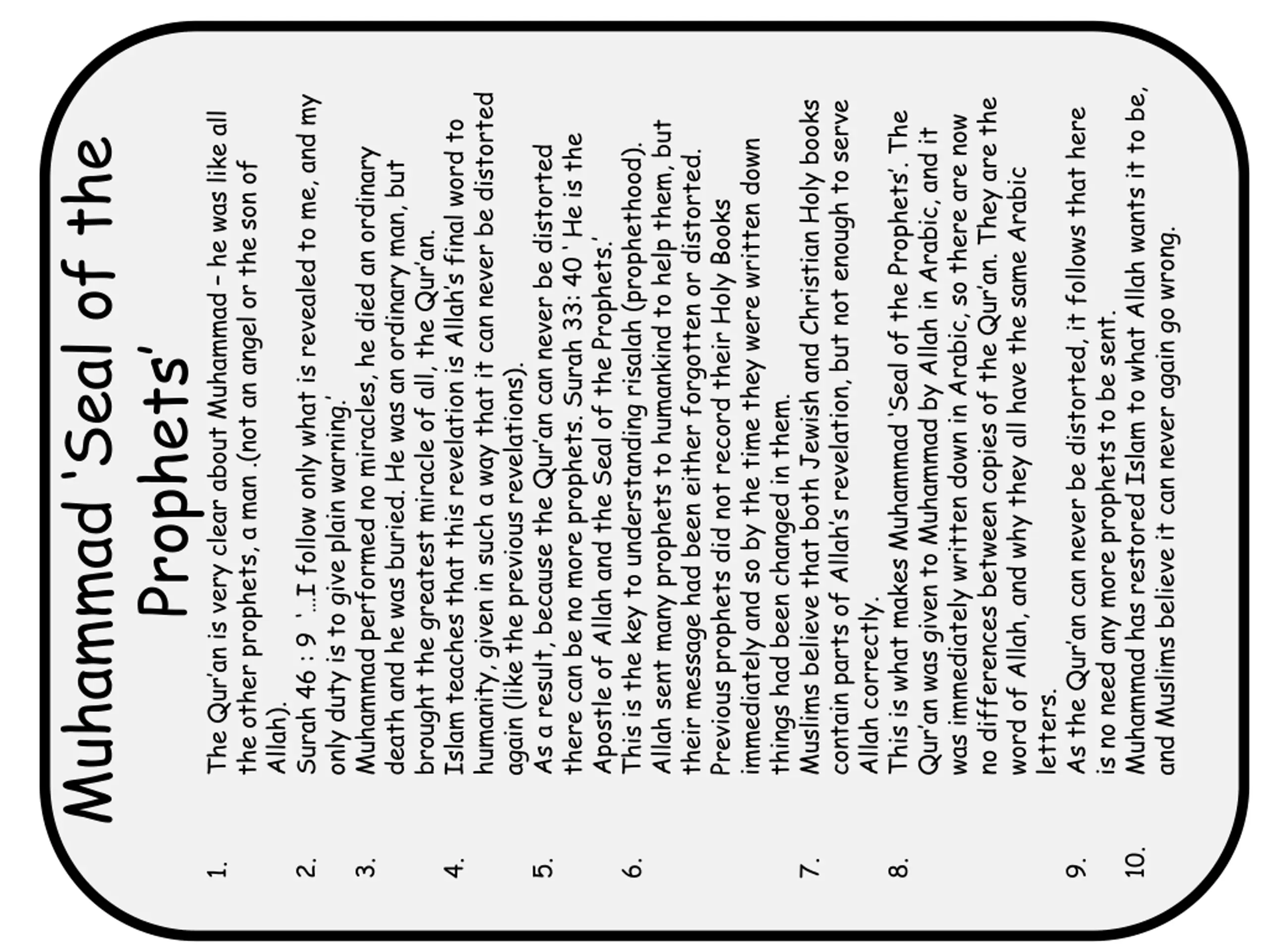 Muhammad has restored Islam to what Allah wants it to be, humanity, given in such a way that it can never be distorted Surah 46 : 9 I follow only what is revealed to me, and my no differences between copies of the Qur an. They are the Muslims believe that both Jewish and Christian Holy books contain parts of Allah s revelation, but not enough to serve As the Qur an can never be distorted, it follows that here The Qur an is very clear about Muhammad he was like all This is what makes Muhammad Seal of the Prophets . The was immediately written down in Arabic, so there are now Islam teaches that this revelation is Allah s final word to Allah sent many prophets to humankind to help them, but Muhammad Seal of the Qur an was given to Muhammad by Allah in Arabic, and it there can be no more prophets. Surah 33: 40 He is the immediately and so by the time they were written down This is the key to understanding risalah (prophethood). As a result, because the Qur an can never be distorted Muhammad performed no miracles, he died an ordinary their message had been either forgotten or distorted. the other prophets, a man .(not an angel or the son of death and he was buried. He was an ordinary man, but word of Allah, and why they all have the same Arabic Previous prophets did not record their Holy Books and Muslims believe it can never again go wrong. brought the greatest miracle of all, the Qur an. Apostle of Allah and the Seal of the Prophets. is no need any more prophets to be sent. Prophets again (like the previous revelations). things had been changed in them. only duty is to give plain warning. Allah correctly. letters. Allah). 10. 2. 3. 4. 5. 6. 7. 8. 9. 1.