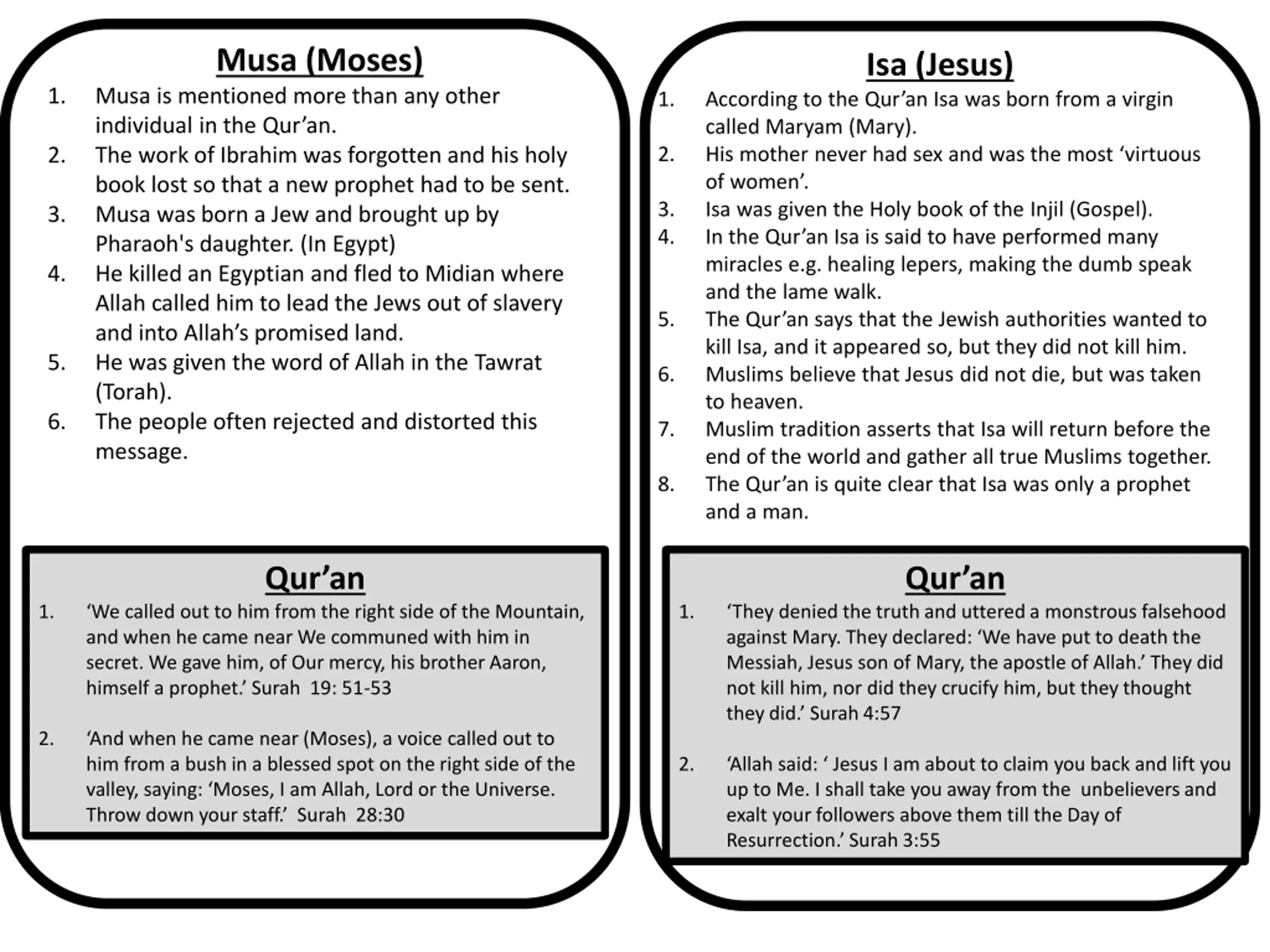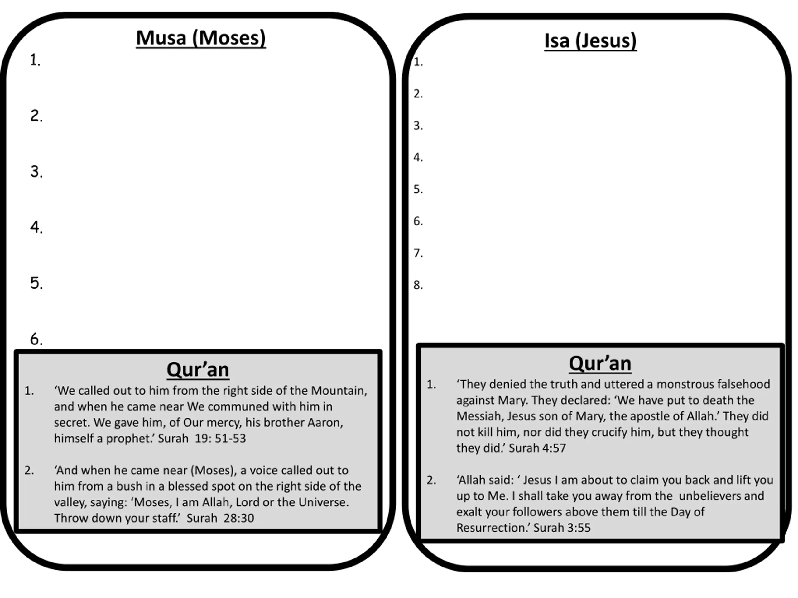 Musa (Moses) Isa (Jesus) 1. 1. 2. 2. 3. 4. 3. 5. 6. 4. 7. 5. 8. 6. Qur an Qur an 1. They denied the truth and uttered a monstrous falsehood against Mary. They declared: We have put to death the Messiah, Jesus son of Mary, the apostle of Allah. They did not kill him, nor did they crucify him, but they thought they did. Surah 4:57 1. We called out to him from the right side of the Mountain, and when he came near We communed with him in secret. We gave him, of Our mercy, his brother Aaron, himself a prophet. Surah 19: 51-53 2. And when he came near (Moses), a voice called out to him from a bush in a blessed spot on the right side of the valley, saying: Moses, I am Allah, Lord or the Universe. Throw down your staff. Surah 28:30 2. Allah said: Jesus I am about to claim you back and lift you up to Me. I shall take you away from the unbelievers and exalt your followers above them till the Day of Resurrection. Surah 3:55