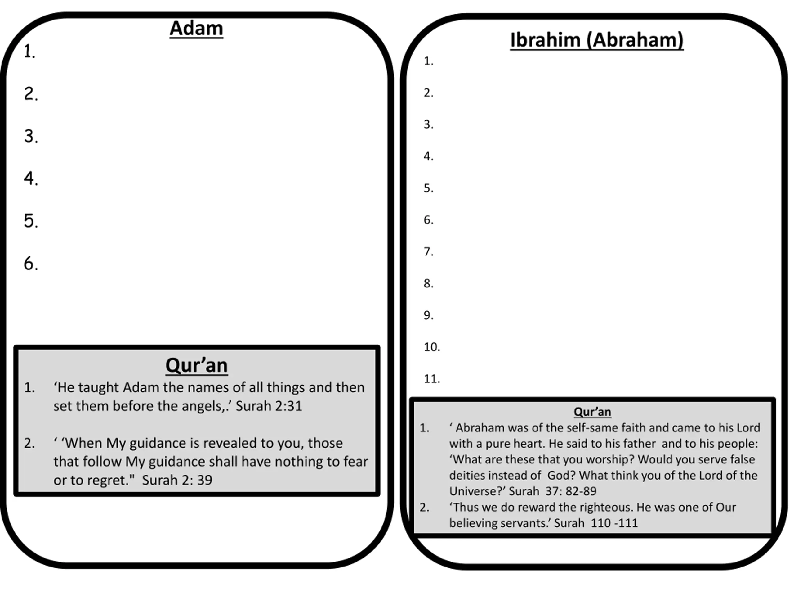 Adam Ibrahim (Abraham) 1. 1. 2. 2. 3. 3. 4. 4. 5. 5. 6. 7. 6. 8. 9. 10. Qur an 11. 1. He taught Adam the names of all things and then set them before the angels,. Surah 2:31 Qur an 1. Abraham was of the self-same faith and came to his Lord with a pure heart. He said to his father and to his people: What are these that you worship? Would you serve false deities instead of God? What think you of the Lord of the Universe? Surah 37: 82-89 Thus we do reward the righteous. He was one of Our believing servants. Surah 110 -111 2. When My guidance is revealed to you, those that follow My guidance shall have nothing to fear or to regret." Surah 2: 39 2.