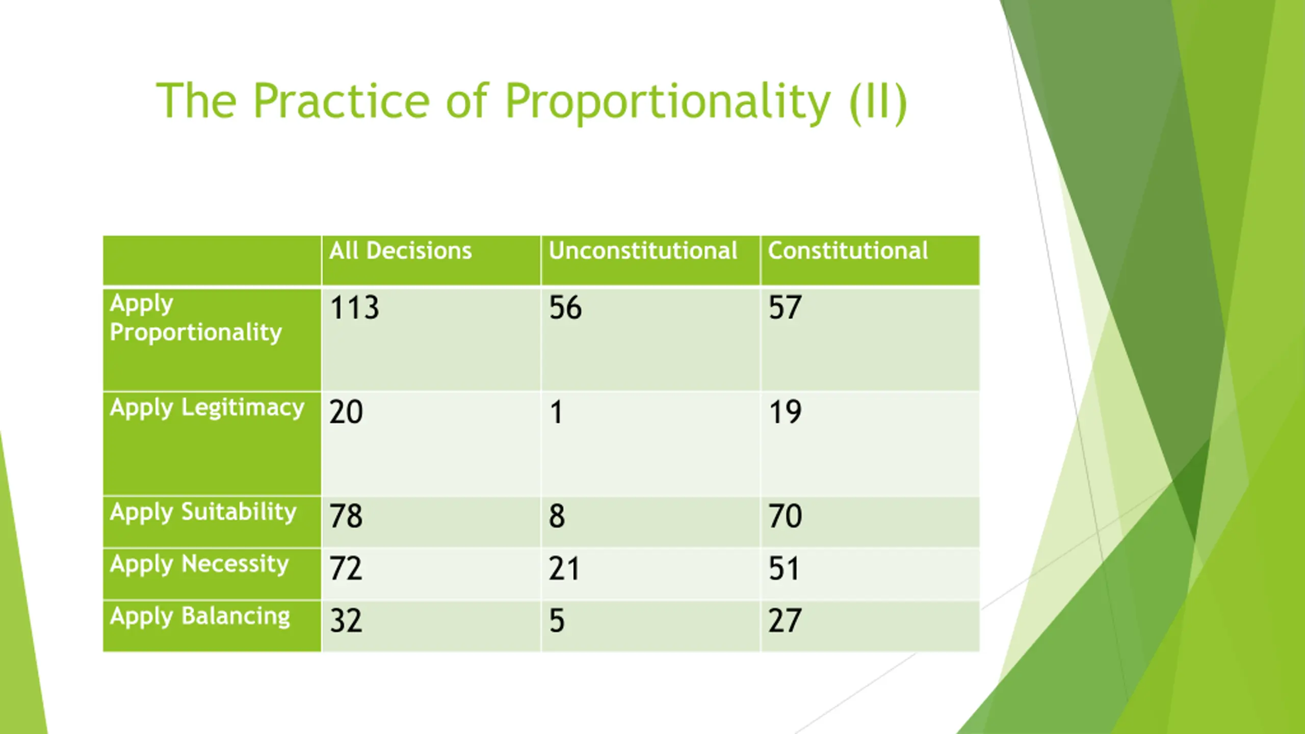 The Practice of Proportionality (II) All Decisions Unconstitutional Constitutional Apply Proportionality 113 56 57 Apply Legitimacy 20 1 19 Apply Suitability 78 72 32 8 21 5 70 51 27 Apply Necessity Apply Balancing