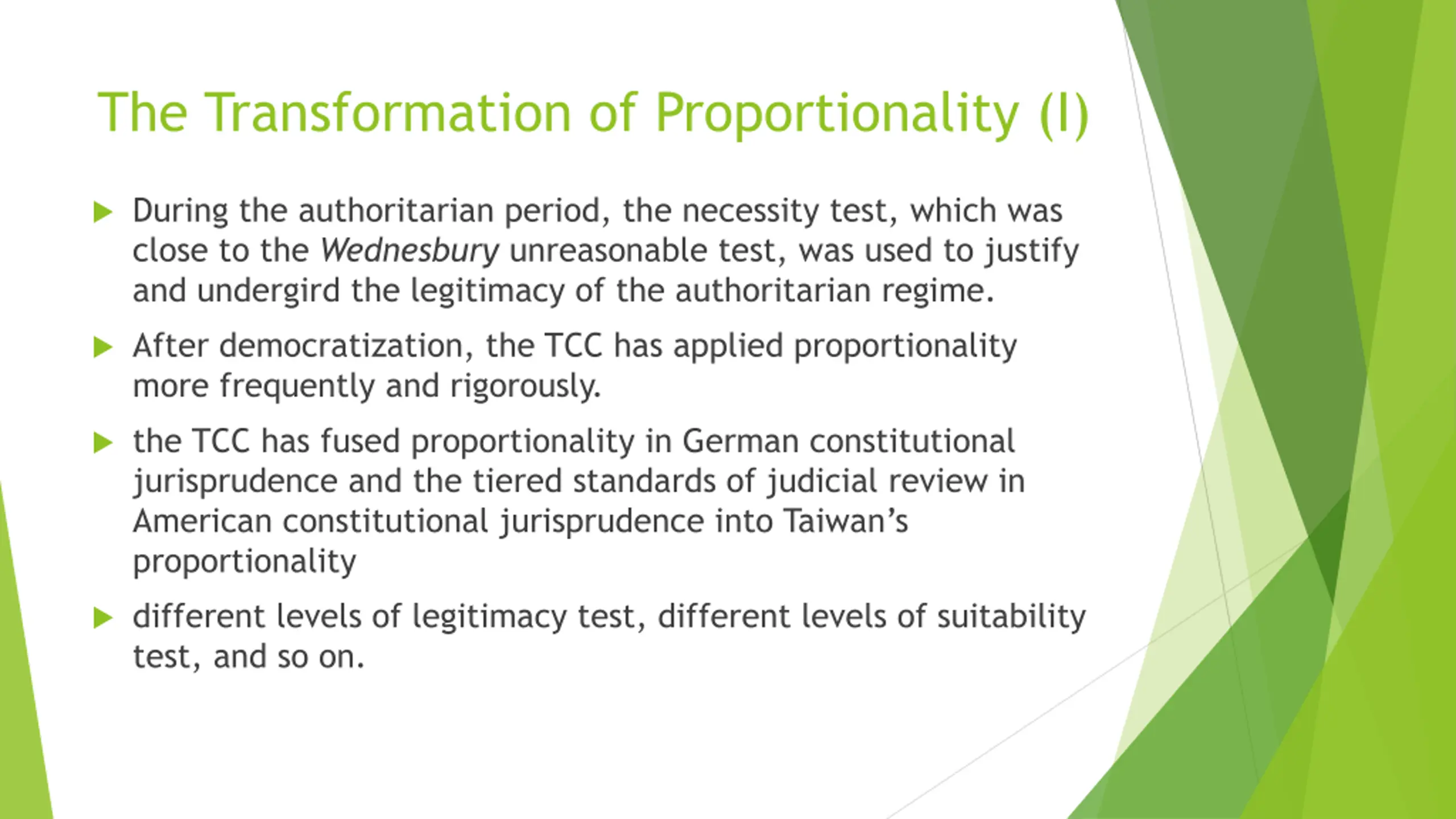 The Transformation of Proportionality (I) During the authoritarian period, the necessity test, which was close to the Wednesbury unreasonable test, was used to justify and undergird the legitimacy of the authoritarian regime. After democratization, the TCC has applied proportionality more frequently and rigorously. the TCC has fused proportionality in German constitutional jurisprudence and the tiered standards of judicial review in American constitutional jurisprudence into Taiwan s proportionality different levels of legitimacy test, different levels of suitability test, and so on.