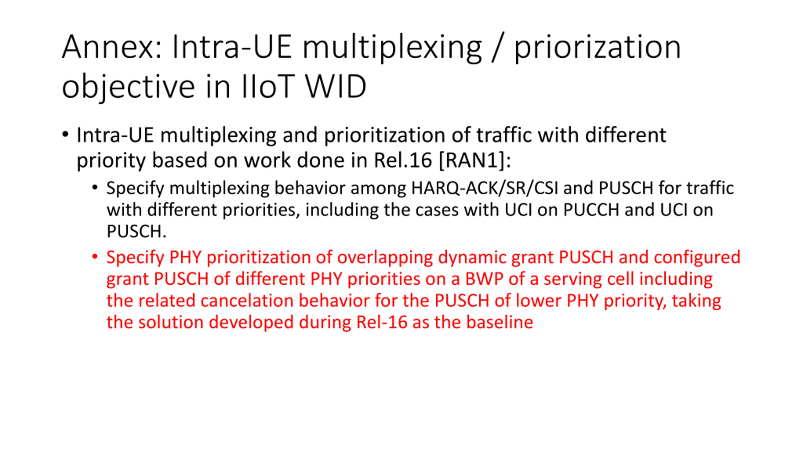 Annex: Intra-UE multiplexing / priorization objective in IIoT WID Intra-UE multiplexing and prioritization of traffic with different priority based on work done in Rel.16 [RAN1]: Specify multiplexing behavior among HARQ-ACK/SR/CSI and PUSCH for traffic with different priorities, including the cases with UCI on PUCCH and UCI on PUSCH. Specify PHY prioritization of overlapping dynamic grant PUSCH and configured grant PUSCH of different PHY priorities on a BWP of a serving cell including the related cancelation behavior for the PUSCH of lower PHY priority, taking the solution developed during Rel-16 as the baseline