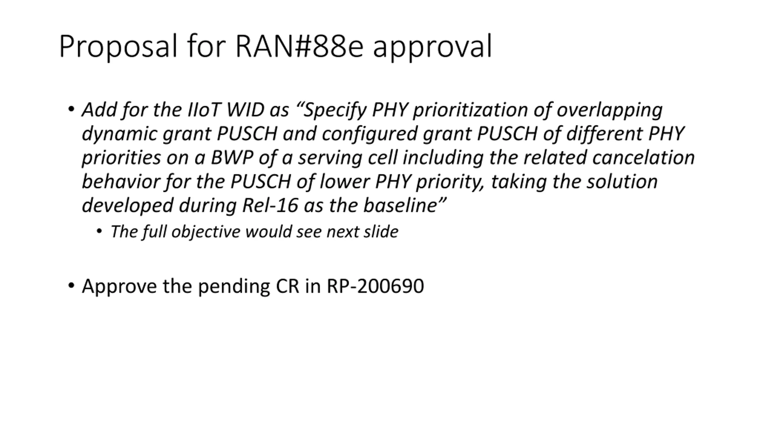 Proposal for RAN#88e approval Add for the IIoT WID as Specify PHY prioritization of overlapping dynamic grant PUSCH and configured grant PUSCH of different PHY priorities on a BWP of a serving cell including the related cancelation behavior for the PUSCH of lower PHY priority, taking the solution developed during Rel-16 as the baseline The full objective would see next slide Approve the pending CR in RP-200690