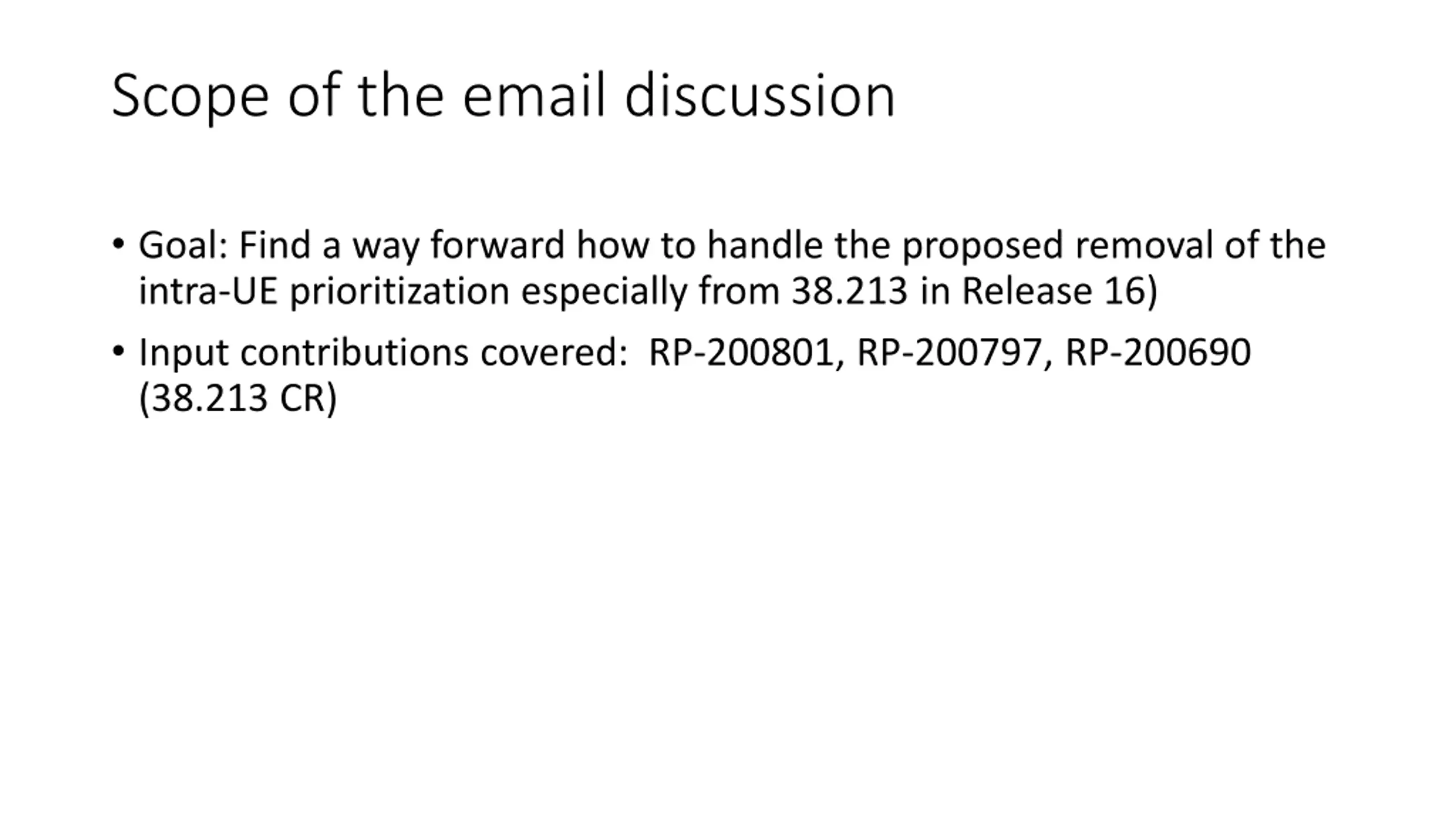 Scope of the email discussion Goal: Find a way forward how to handle the proposed removal of the intra-UE prioritization especially from 38.213 in Release 16) Input contributions covered: RP-200801, RP-200797, RP-200690 (38.213 CR)