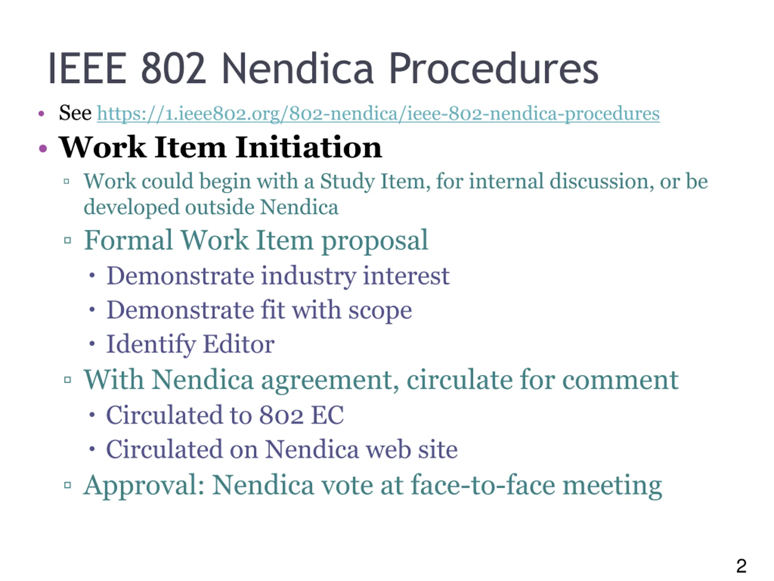 2 IEEE 802 Nendica Procedures See https://1.ieee802.org/802-nendica/ieee-802-nendica-procedures Work Item Initiation Work could begin with a Study Item, for internal discussion, or be developed outside Nendica Formal Work Item proposal Demonstrate industry interest Demonstrate fit with scope Identify Editor With Nendica agreement, circulate for comment Circulated to 802 EC Circulated on Nendica web site Approval: Nendica vote at face-to-face meeting 2