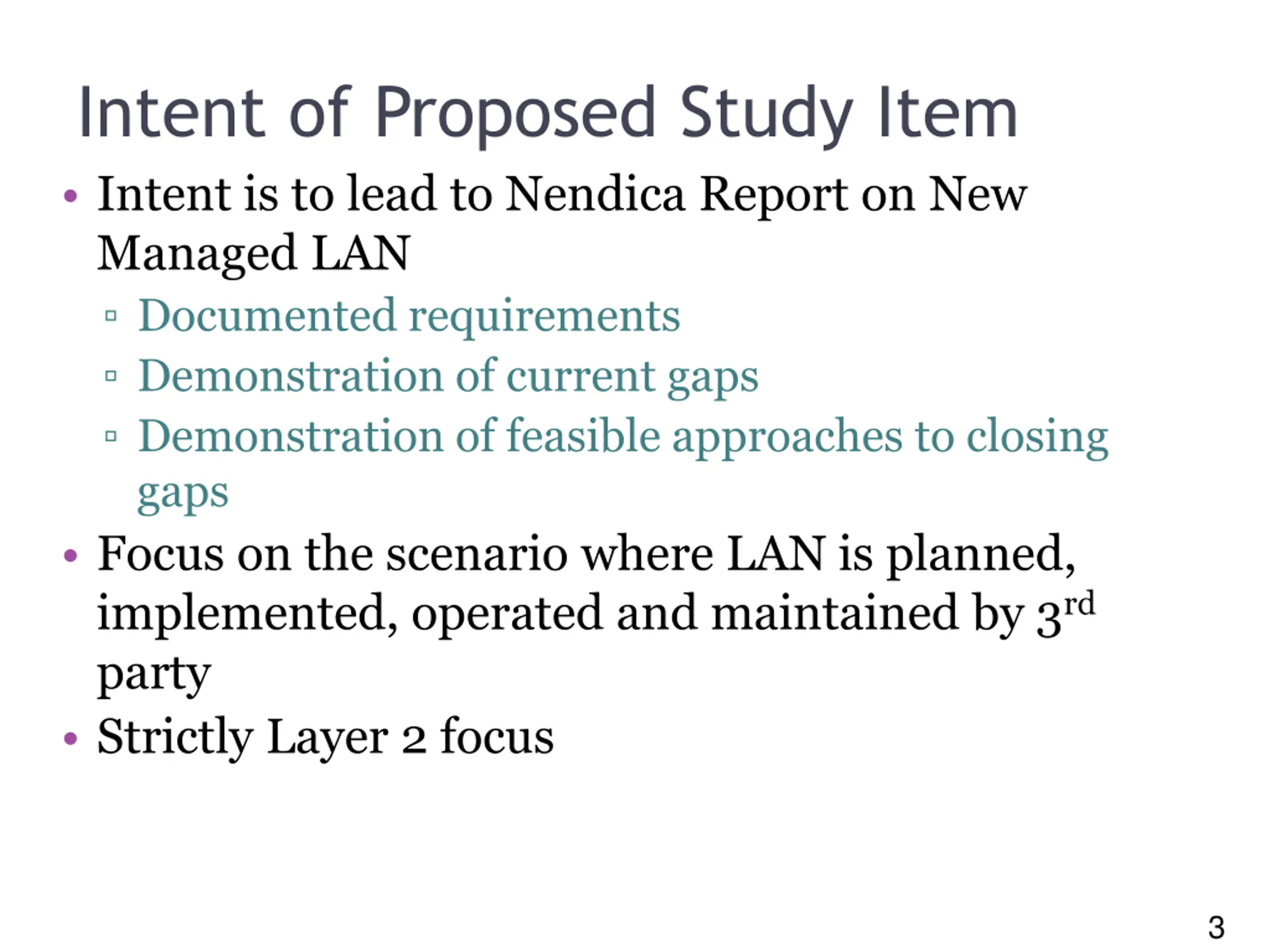 3 Intent of Proposed Study Item Intent is to lead to Nendica Report on New Managed LAN Documented requirements Demonstration of current gaps Demonstration of feasible approaches to closing gaps Focus on the scenario where LAN is planned, implemented, operated and maintained by 3rd party Strictly Layer 2 focus 3