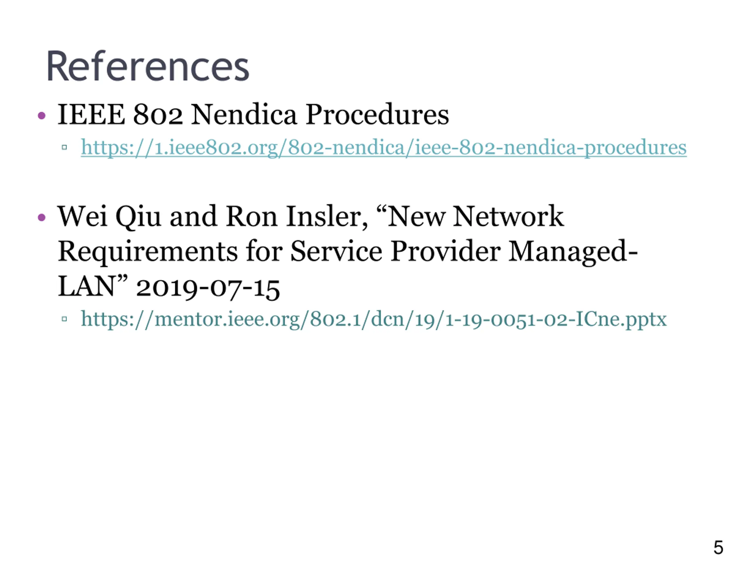 5 References IEEE 802 Nendica Procedures https://1.ieee802.org/802-nendica/ieee-802-nendica-procedures Wei Qiu and Ron Insler, New Network Requirements for Service Provider Managed- LAN 2019-07-15 https://mentor.ieee.org/802.1/dcn/19/1-19-0051-02-ICne.pptx 5