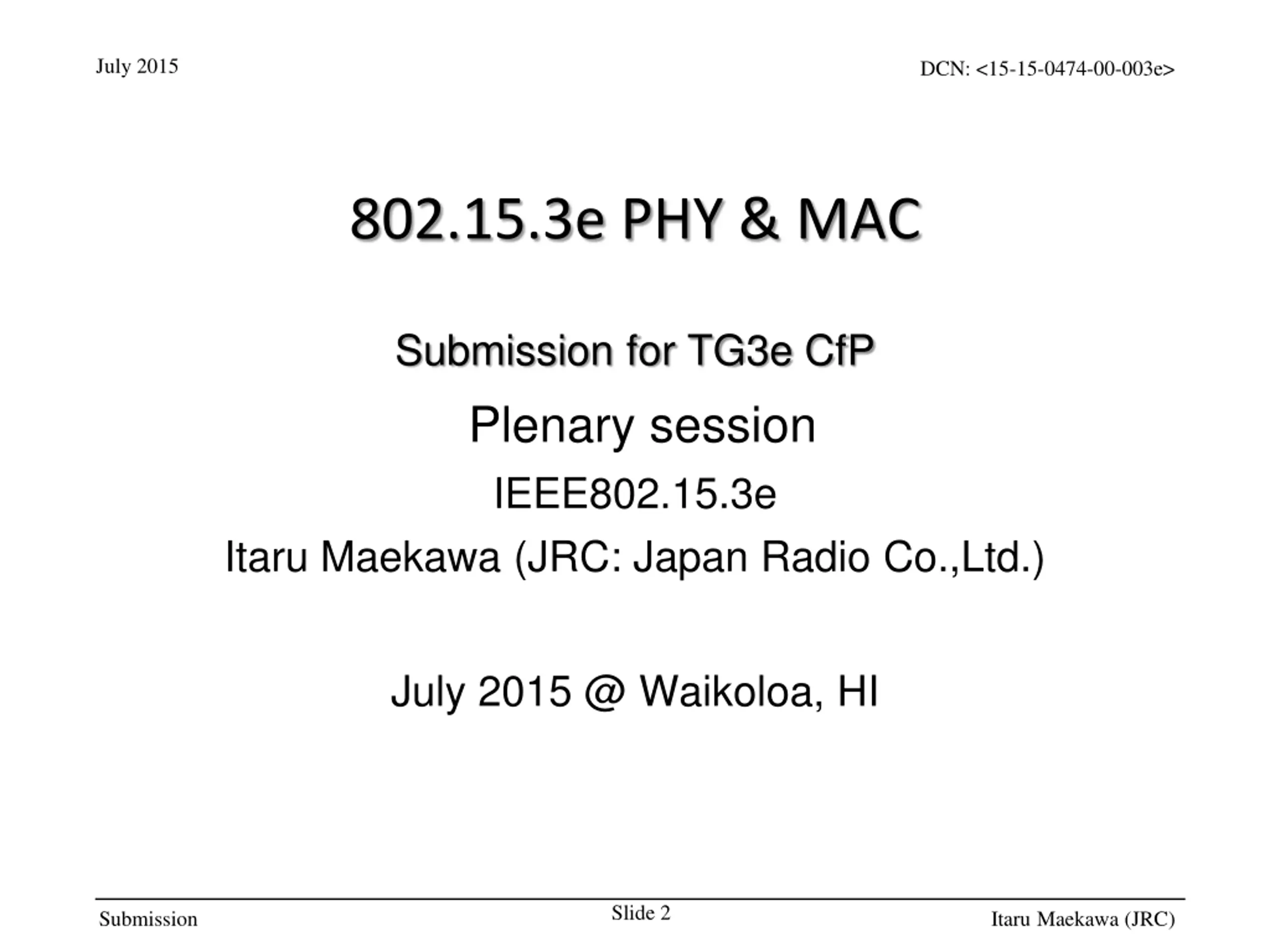 July 2015 DCN: <15-15-0474-00-003e> 802.15.3e PHY & MAC Submission for TG3e CfP Plenary session IEEE802.15.3e Itaru Maekawa (JRC: Japan Radio Co.,Ltd.) July 2015 @ Waikoloa, HI Slide 2 Submission Itaru Maekawa (JRC)