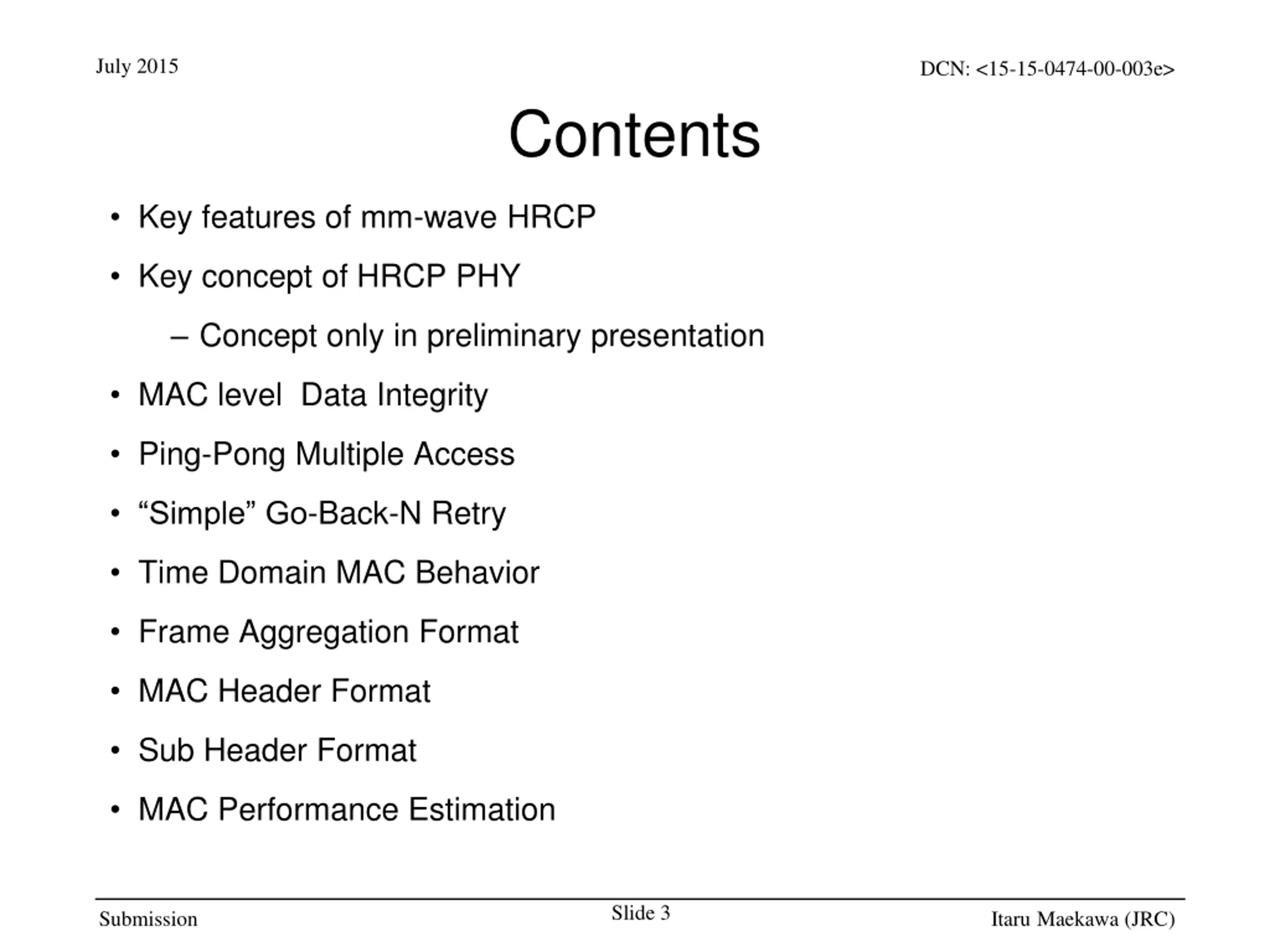 July 2015 DCN: <15-15-0474-00-003e> Contents Key features of mm-wave HRCP Key concept of HRCP PHY Concept only in preliminary presentation MAC level Data Integrity Ping-Pong Multiple Access Simple Go-Back-N Retry Time Domain MAC Behavior Frame Aggregation Format MAC Header Format Sub Header Format MAC Performance Estimation Slide 3 Submission Itaru Maekawa (JRC)