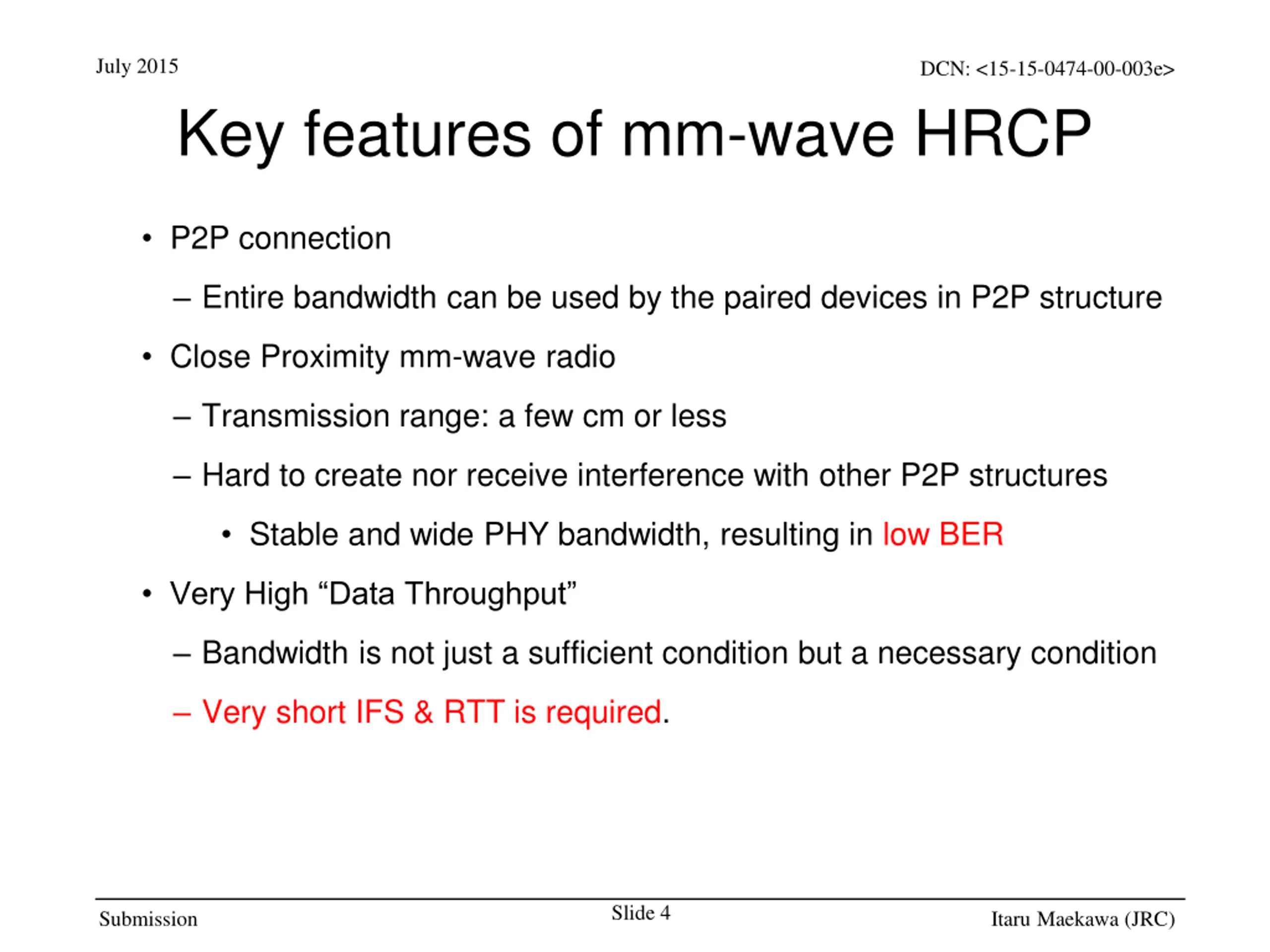 July 2015 DCN: <15-15-0474-00-003e> Key features of mm-wave HRCP P2P connection Entire bandwidth can be used by the paired devices in P2P structure Close Proximity mm-wave radio Transmission range: a few cm or less Hard to create nor receive interference with other P2P structures Stable and wide PHY bandwidth, resulting in low BER Very High Data Throughput Bandwidth is not just a sufficient condition but a necessary condition Very short IFS & RTT is required. Slide 4 Submission Itaru Maekawa (JRC)