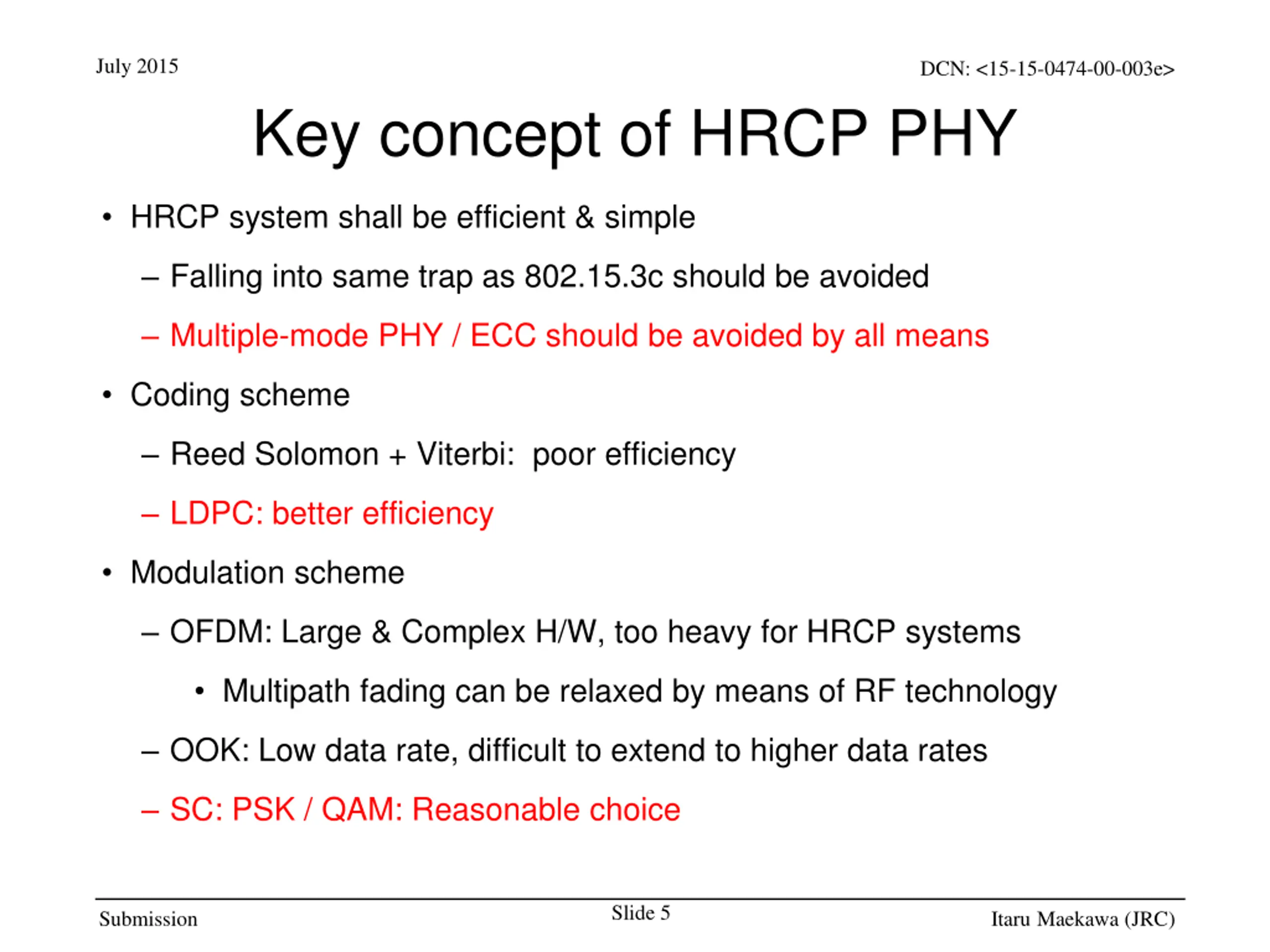 July 2015 DCN: <15-15-0474-00-003e> Key concept of HRCP PHY HRCP system shall be efficient & simple Falling into same trap as 802.15.3c should be avoided Multiple-mode PHY / ECC should be avoided by all means Coding scheme Reed Solomon + Viterbi: poor efficiency LDPC: better efficiency Modulation scheme OFDM: Large & Complex H/W, too heavy for HRCP systems Multipath fading can be relaxed by means of RF technology OOK: Low data rate, difficult to extend to higher data rates SC: PSK / QAM: Reasonable choice Slide 5 Submission Itaru Maekawa (JRC)