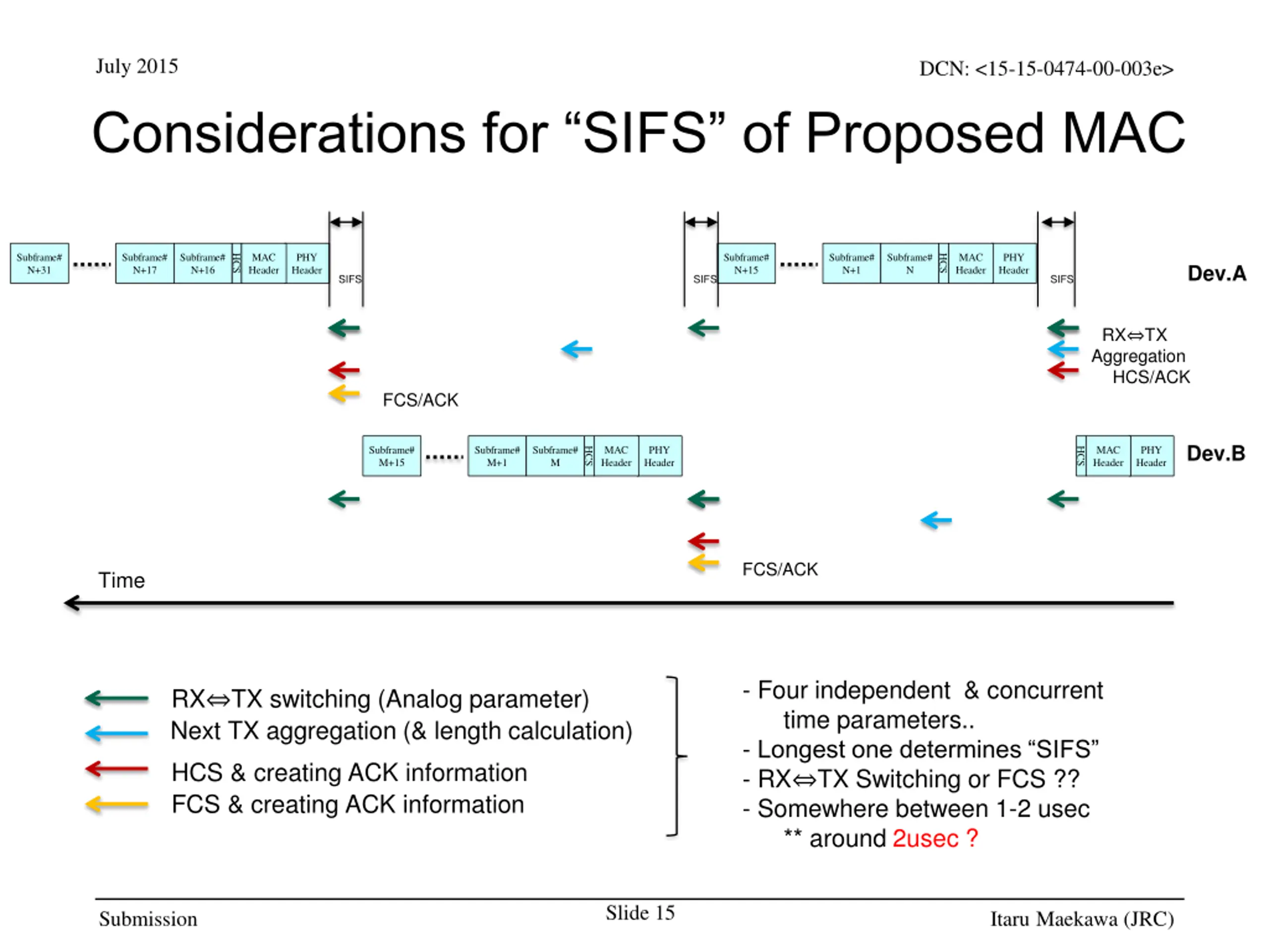 July 2015 Considerations for SIFS of Proposed MAC DCN: <15-15-0474-00-003e> Subframe# N+31 Subframe# N+17 Subframe# N+16 MAC Header PHY Header Subframe# N+15 Subframe# N+1 Subframe# N MAC Header PHY Header HCS HCS Dev.A SIFS SIFS SIFS RX TX Aggregation HCS/ACK FCS/ACK Dev.B Subframe# M+15 Subframe# M+1 Subframe# M MAC Header PHY Header MAC Header PHY Header HCS HCS FCS/ACK Time - Four independent & concurrent time parameters.. - Longest one determines SIFS - RX TX Switching or FCS ?? - Somewhere between 1-2 usec ** around 2usec ? RX TX switching (Analog parameter) Next TX aggregation (& length calculation) HCS & creating ACK information FCS & creating ACK information Slide 15 Submission Itaru Maekawa (JRC)