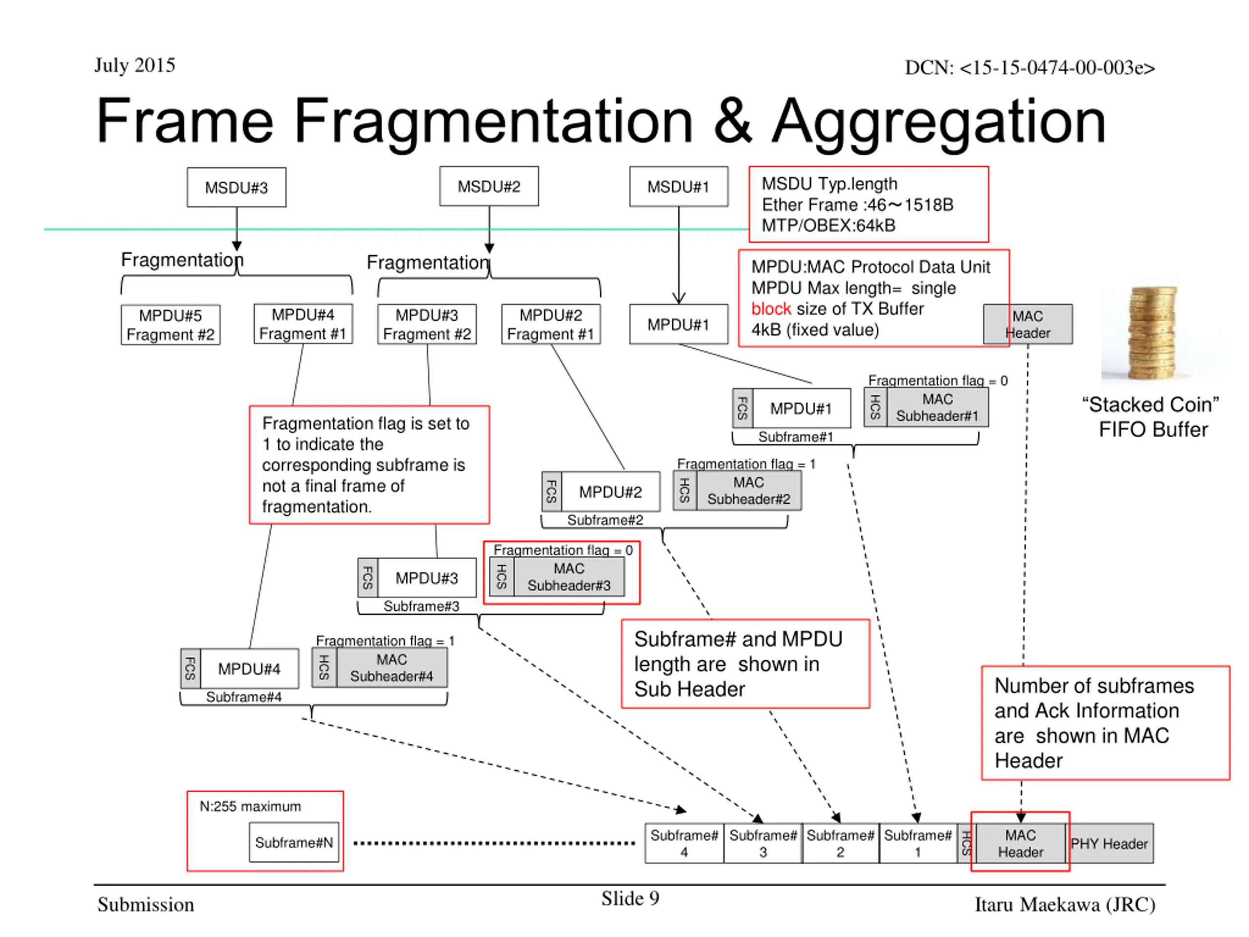 July 2015 Frame Fragmentation & Aggregation DCN: <15-15-0474-00-003e> MSDU Typ.length Ether Frame :46 1518B MTP/OBEX:64kB MSDU#2 MSDU#1 MSDU#3 Fragmentation Fragmentation MPDU:MAC Protocol Data Unit MPDU Max length= single block size of TX Buffer 4kB (fixed value) MPDU#4 Fragment #1 MPDU#3 Fragment #2 MPDU#2 Fragment #1 MPDU#5 Fragment #2 MAC Header MPDU#1 Fragmentation flag = 0 MAC Subheader#1 Stacked Coin FIFO Buffer HCS FCS MPDU#1 Fragmentation flag is set to 1 to indicate the corresponding subframe is not a final frame of fragmentation. Subframe#1 Fragmentation flag = 1 MAC Subheader#2 HCS FCS MPDU#2 Subframe#2 Fragmentation flag = 0 MAC Subheader#3 HCS FCS MPDU#3 Subframe#3 Subframe# and MPDU length are shown in Sub Header Fragmentation flag = 1 MAC Subheader#4 HCS FCS MPDU#4 Number of subframes and Ack Information are shown in MAC Header Subframe#4 N:255 maximum Subframe# 4 Subframe# 3 Subframe# 2 Subframe# 1 MAC Header HCS Subframe#N PHY Header Slide 9 Submission Itaru Maekawa (JRC)