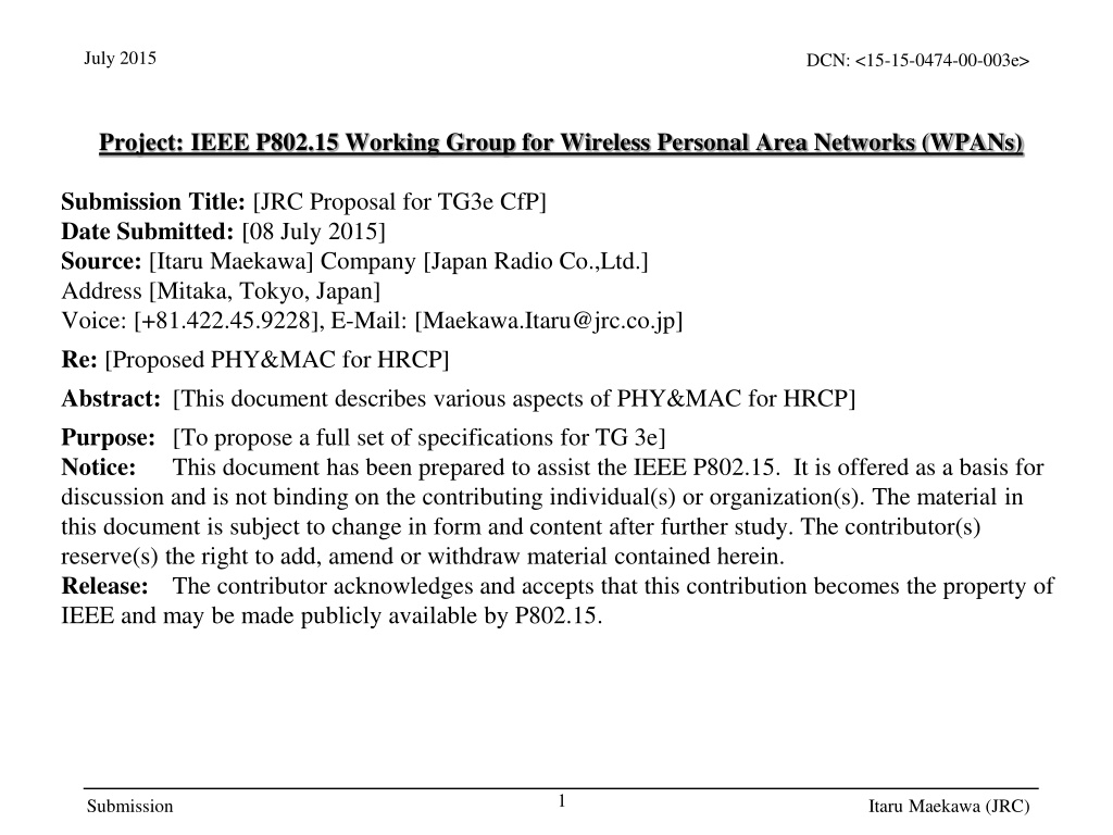 July 2015 DCN: <15-15-0474-00-003e> Project: IEEE P802.15 Working Group for Wireless Personal Area Networks (WPANs) Submission Title: [JRC Proposal for TG3e CfP] Date Submitted: [08 July 2015] Source: [Itaru Maekawa] Company [Japan Radio Co.,Ltd.] Address [Mitaka, Tokyo, Japan] Voice: [+81.422.45.9228], E-Mail: [Maekawa.Itaru@jrc.co.jp] Re: [Proposed PHY&MAC for HRCP] Abstract: [This document describes various aspects of PHY&MAC for HRCP] Purpose: [To propose a full set of specifications for TG 3e] Notice: This document has been prepared to assist the IEEE P802.15. It is offered as a basis for discussion and is not binding on the contributing individual(s) or organization(s). The material in this document is subject to change in form and content after further study. The contributor(s) reserve(s) the right to add, amend or withdraw material contained herein. Release: The contributor acknowledges and accepts that this contribution becomes the property of IEEE and may be made publicly available by P802.15. 1 Submission Itaru Maekawa (JRC)